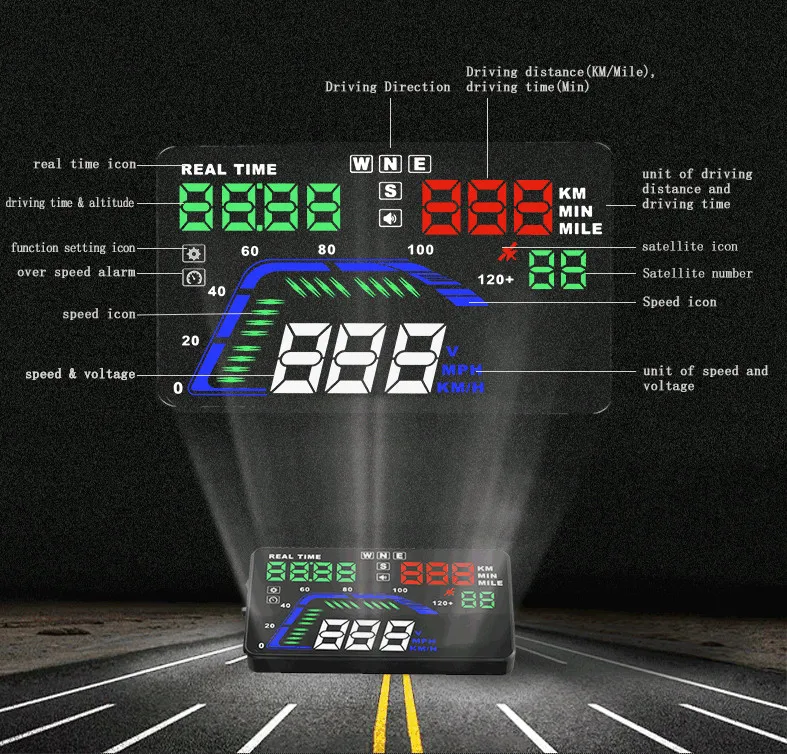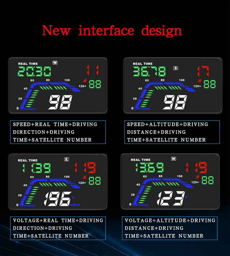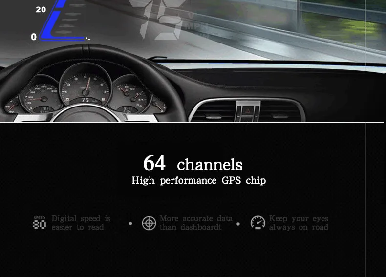 Отображение богатого содержания: скорость, направление движения, время вождения, расстояние вождения, часы, номер спутника, высота, будильник скорости, свободное переключение между километром и милей