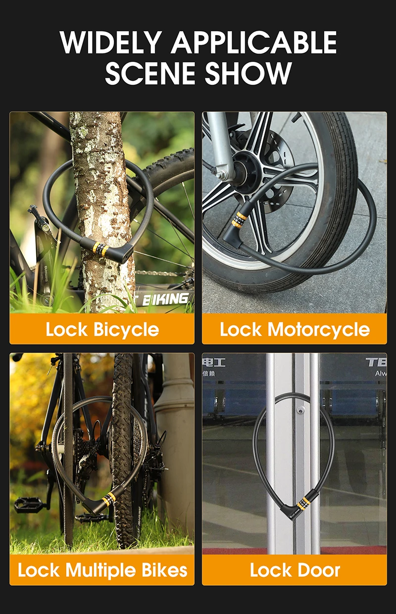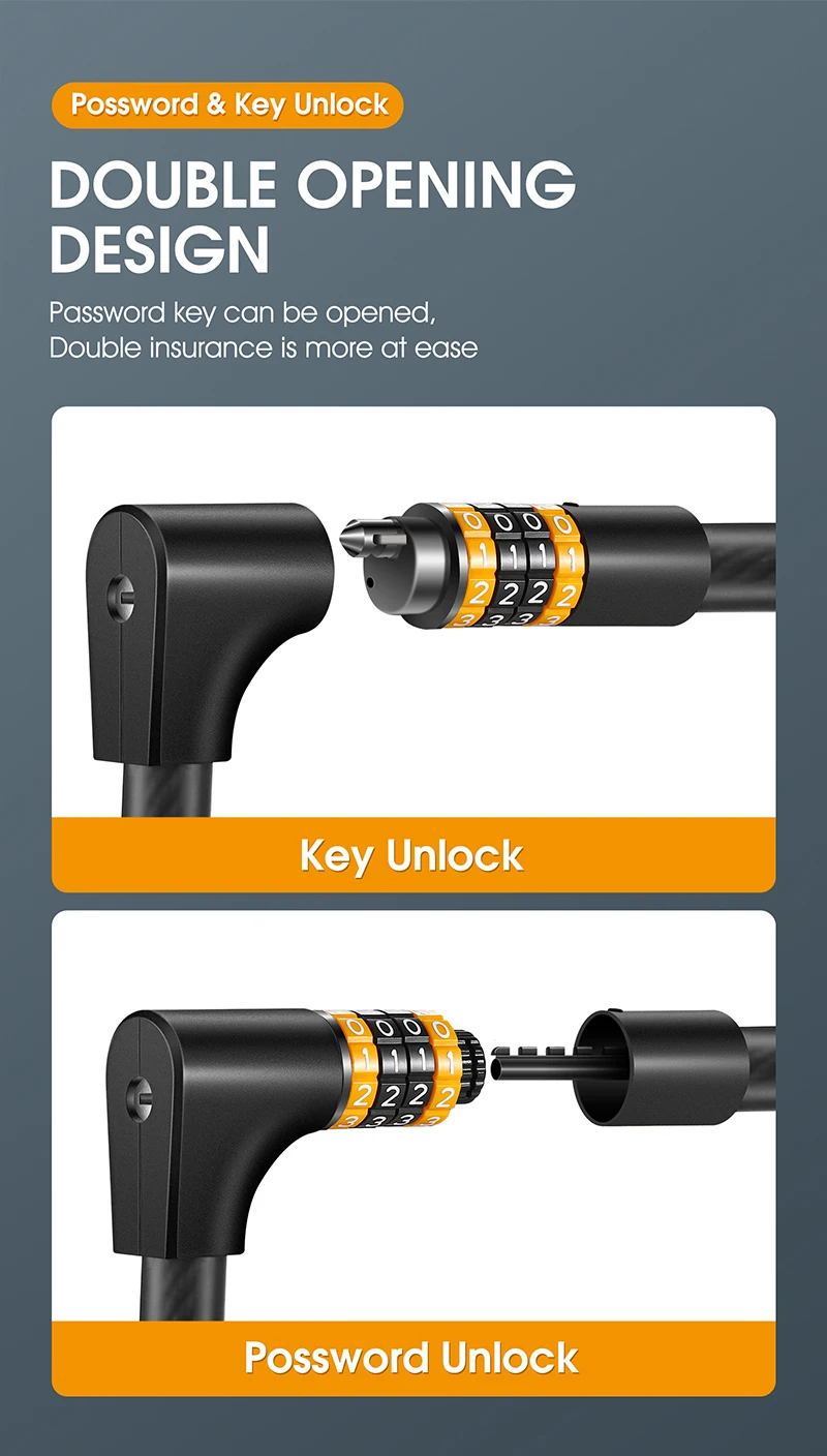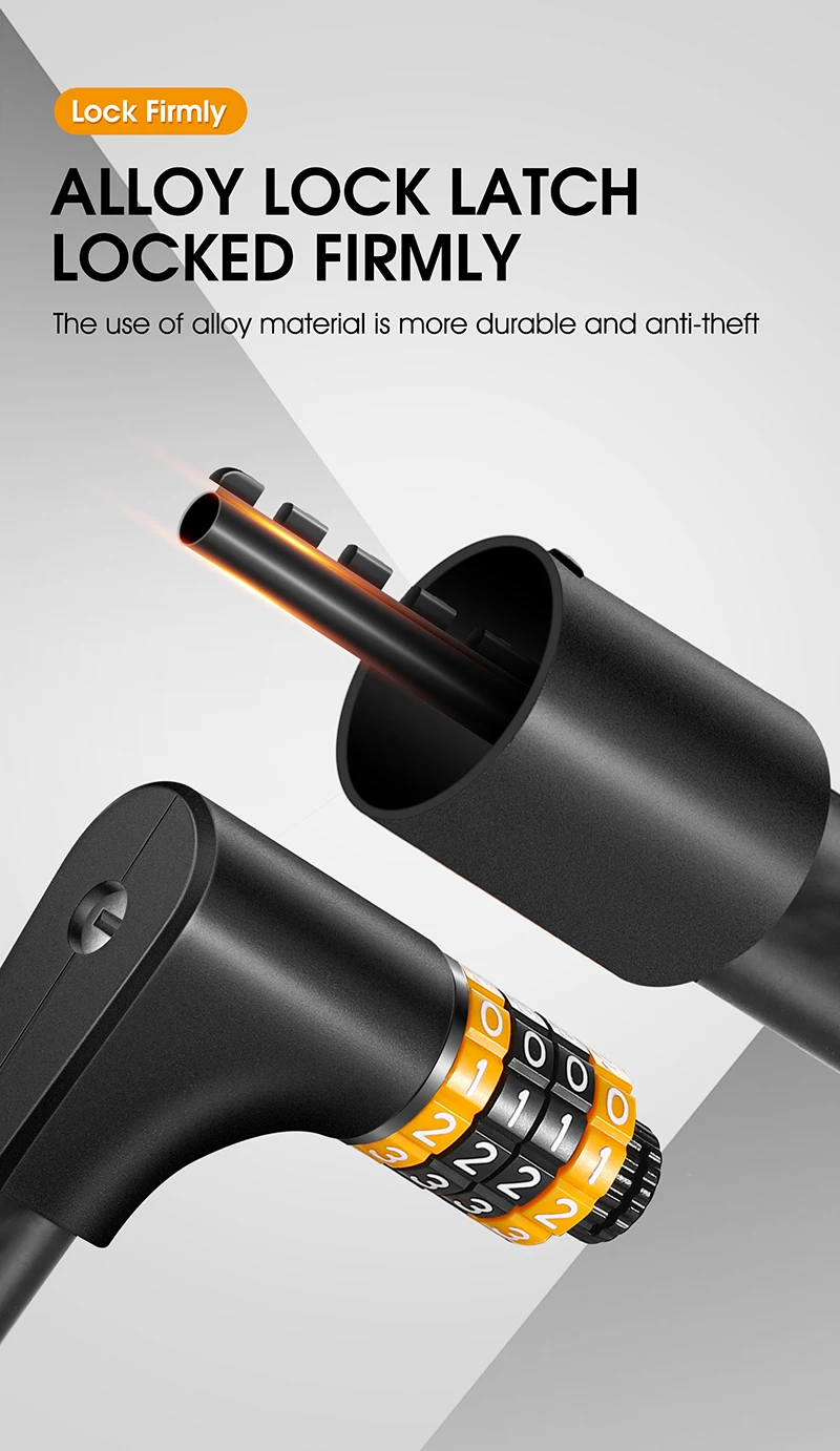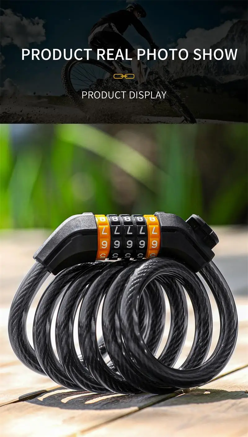 3. High-quality and durable materials - The built-in code lock is made of solid steel cable and the cable is made of environmentally friendly PVC. The locking structure is made of zinc alloy, and the surface of the lock rope is electrophoretic black, which makes the lock more durable and provides you with safer protection and better anti-theft effect.