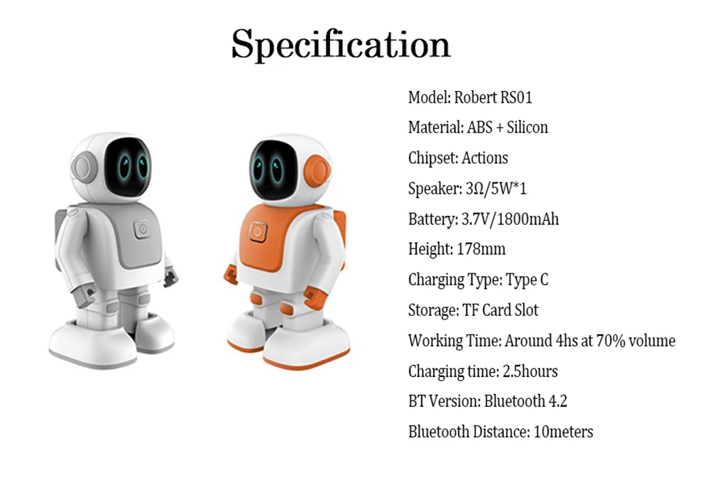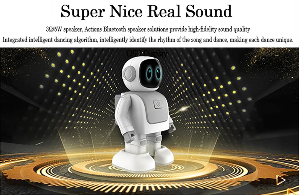 Технология SMART AI: интеллектуальный алгоритм программирования позволяет космонавту интерпретировать аудиовход на лету. Он движется в ритме в своих восхитительных выражениях и движениях тела музыки. Это инновационный, уникальный, перезаряжаемый Bluetooth робот-динамик, который развлекает вас и приносит удовольствие