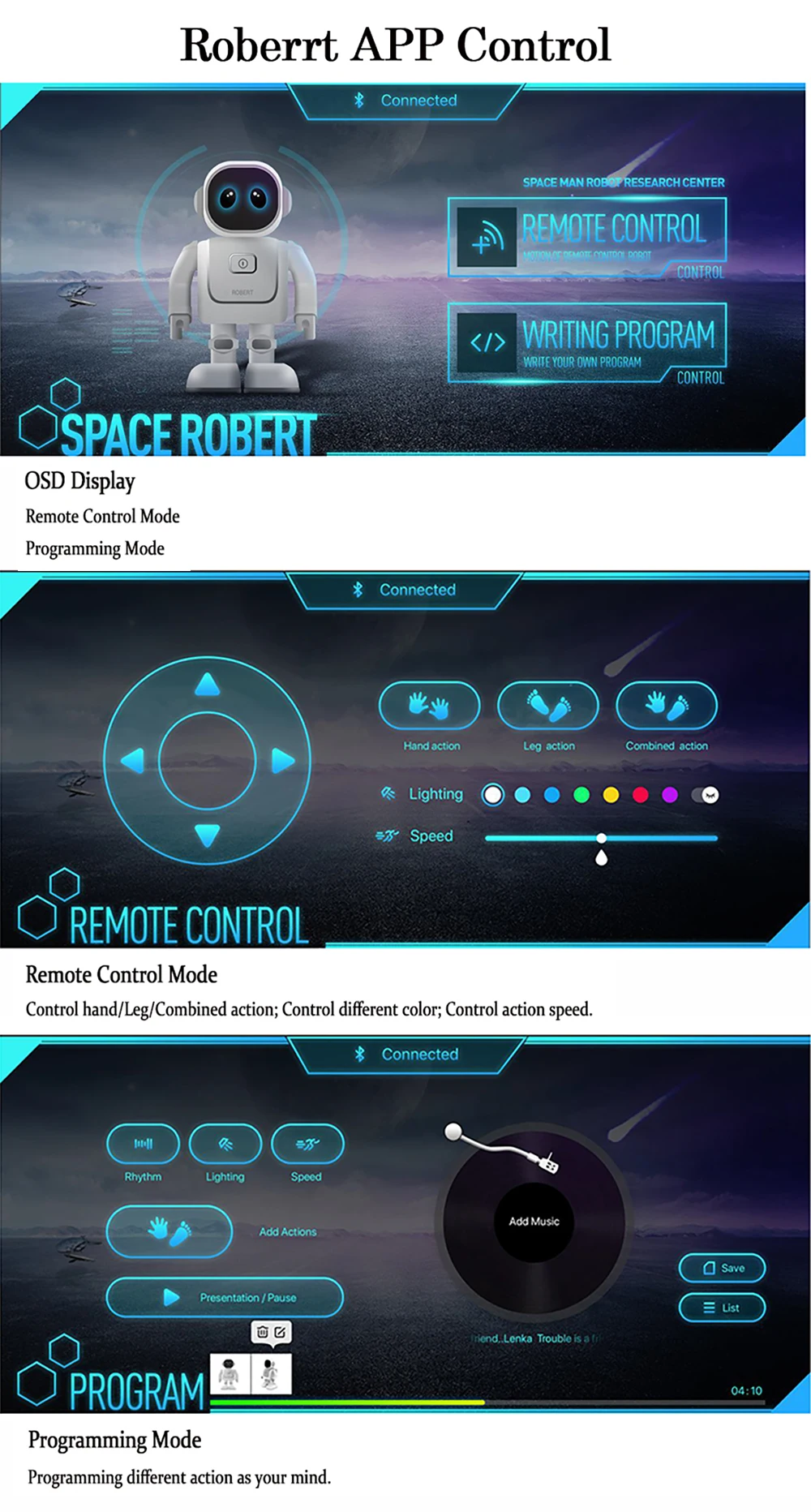 Программируемое действие: дети могут программировать несколько действий в приложении. Космический человек будет автоматически выполнять различные действия в соответствии с запрограммированными движениями и действует во время пения. Это способствует развитию детского творчества и заинтересованности в обучении