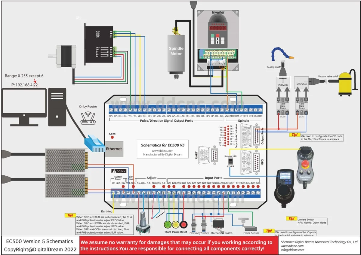 EC500-V5 представляет собой высокопроизводительную секционную плату ethernet для программного обеспечения Mach 3, через Ethernet для связи с подключением сети управляющего компьютера. Совместим с входом MPG, поддерживает stardand MPG и цифровой дисплей MPG нашей компании.