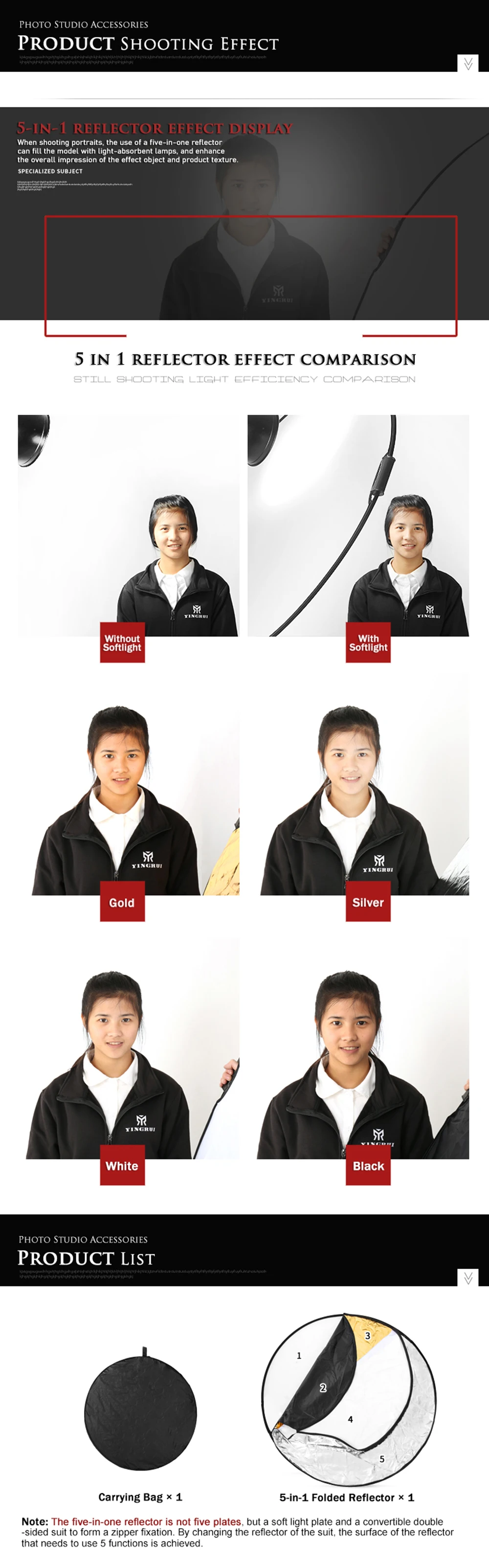 Особенности: 5 в 1 мульти фото отражатель Диск Многоцветный серебристый, золотой, черный, белый, полупрозрачный Профессиональный и популярный отражатель в фотоиндустрии Легкая складная сумка для переноски Сумка на Молнии Описание: Прочный и гибкий Легко носить с собой. Характеристики: Размер: 60 см, 24 дюйма Поверхности: золото, серебро, белый, черный, полупрозрачный Функция светоотражателя Серебро: Для контраста и увеличения яркости Золотой: добиться теплых сияющих оттенков кожи Черный: блокирует нежелательный свет Белый: Нейтральная цветовая температура Полупрозрачный: более мягкий вид без теней Посылка тация: 1x60 см/24 "5 в 1 студийный диск для фотосъемки складной светоотражатель Примечания: 1. Из-за различий между различными дисплеями изображение может не отражать реальный цвет изделия. Мы гарантируем, что стиль такой же, как на картинке. 2. Из-за ручного измерения и различных методов измерения допускается погрешность в 1-3 см. Спасибо!