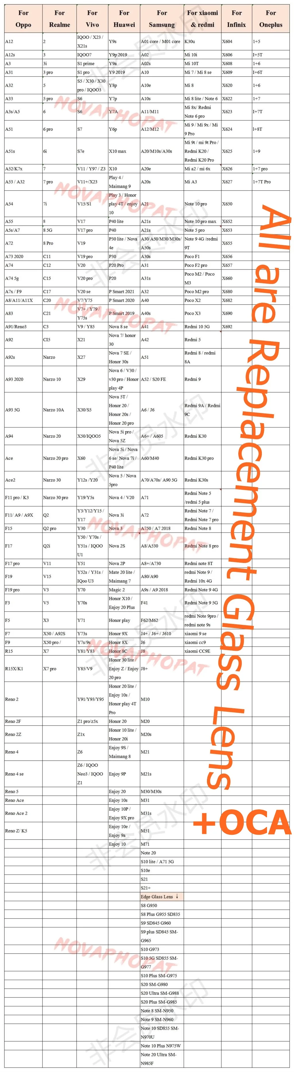 3, We have vary glass lens and glass lens with OCA for different brands and models, below is the list of details for reference, edge glass lens and edge glass lens with oca price different (we have sell links for them as well), others we selling same price, mix models order is acceptable for us , give the order and tell us the detail models and quantity demand we would shipping according ( Mix order Not Include Edge Glass lens and OCA ) .