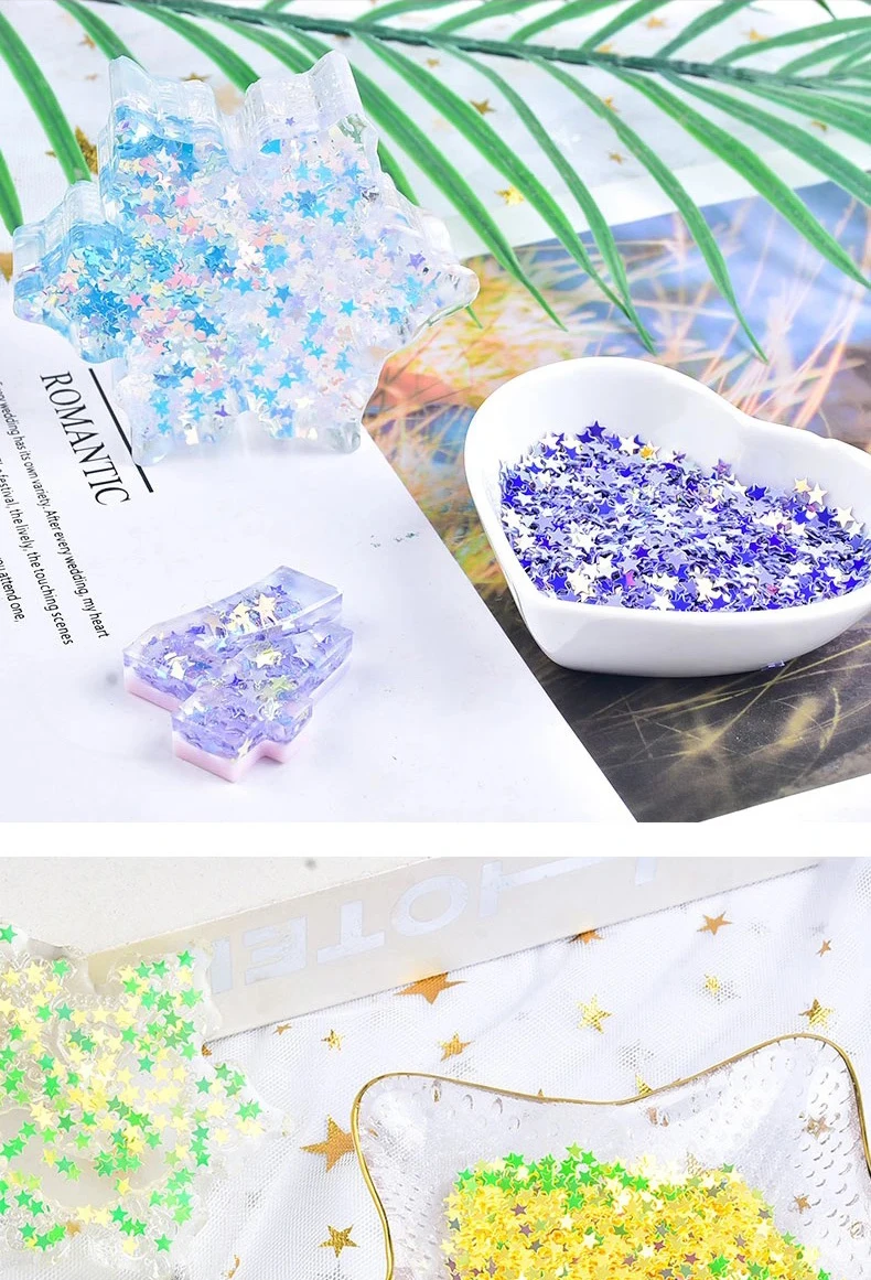 Состояние: 100% новинка. Материал: ПВХ. Форма: звезда с блестками Размер продукта: около 3 мм Цвет: как на фото. Из-за различных настроек контрастности светодиодных мониторов цвет может немного отличаться. Упаковка: белый пакет на молнии и пузырчатый пакет, мы заботимся об упаковке