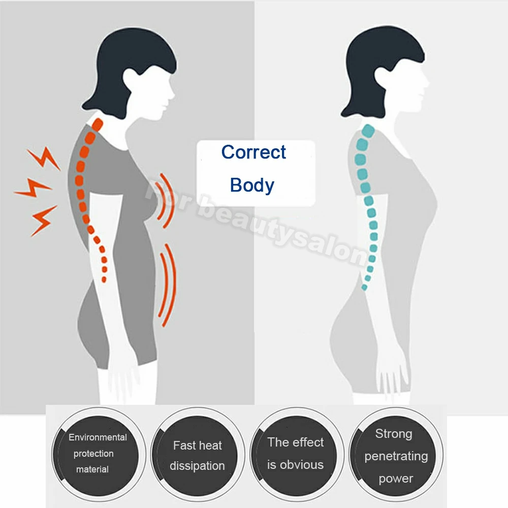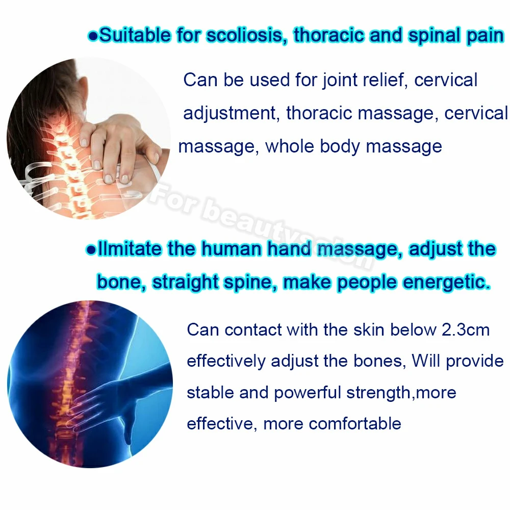 Может контактировать с кожей до 5 см, эффективно регулировать кости, облегчать боли, массировать один раз для более длительного расслабления. Будет обеспечена стабильная и сильная прочность, более эффективная и комфортная. Может стимулировать нервные клетки и нормальную функцию органа, что приводит к быстрому восстановлению функции организма. Подходит для сколиоза, торакального спондилеза, шейного спондилеза, лечения тела. Параметры продукта