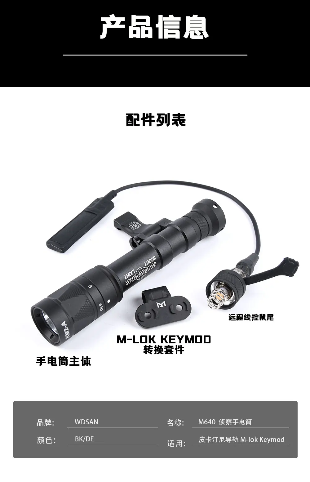 Название продукта: страйкбол M640B M640W M640C M640U тактический фонарик Цвет: черный Материал: PA + minumAlu тактический переключатель фонарика Для: Mlok Keymod 20 мм Пикатинни Питание от: 2x CR123A батареи (не inculde) Функция s1:M640B яркость 560 люменов имеют мгновенную функцию включения и контакта Функция s2: яркость M640W 300 люменов имеют мгновенный-On & Constant-On, светодиодный стробоскоп Функция s3:M640C яркость 340 люменов имеют мгновенную функцию включения и контакта Функция s4:M640U яркость 470 люменов имеют мгновенную функцию включения и контакта