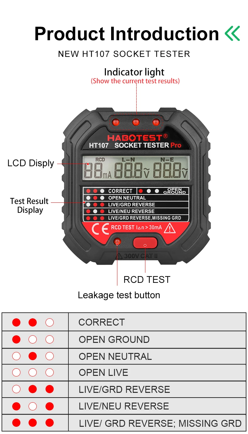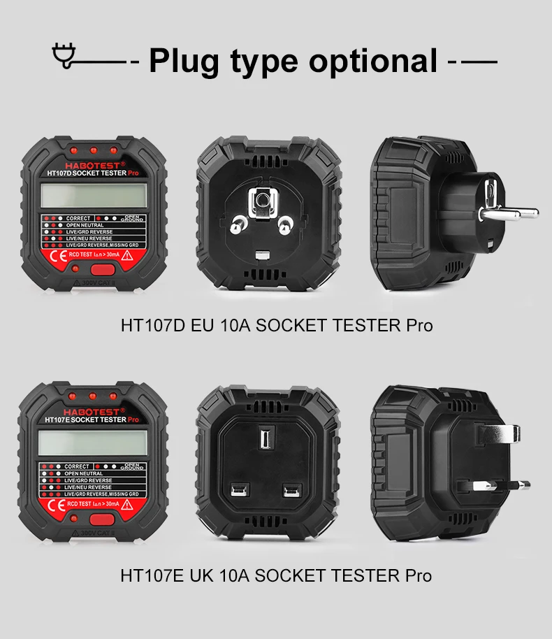 HT107 Спецификация Серии: Бренд: HABOTEST Тип: тестер гнезда Модель: HT107D и HT107E Материал: АБС-пластик Стандарт штепсельной вилки: штепсельная вилка ЕС и Великобритании (опционально) Диапазон фазового напряжения: 90 ~ 250 В/45 ~ 65 Гц Диапазон измерения напряжения утечки: 0 ~ 99 в/45 ~ 65 Гц Точность: ±(2.0% + 2) Тест на Код: Да (>30 мА) Код диапазон рабочего напряжения: 220V ± 20V ЖК-дисплей: Да Подсветка: Да Обнаружение подключения гнезда: ● Правильное соединение ● Открытая площадка ● Открытая нейтральная ● Откройте live ● Обратный провод и заземляющий провод ● Прямой провод и нейтральный провод ● Прямой провод и заземляющий провод Реверсивный, недостающий заземляющий провод Вес: около 50 г Размер: 68 мм x 65 мм x 63 мм