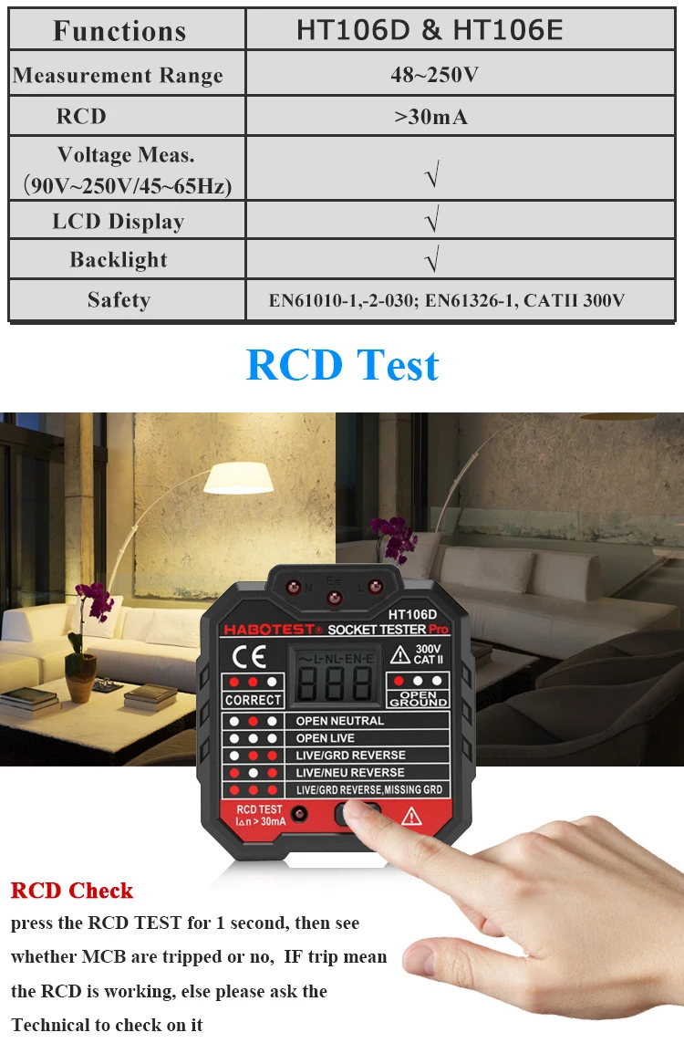 HT106 Спецификация Серии: Бренд: HABOTEST Тип: тестер гнезда Модель: HT106D и HT106E Материал: АБС-пластик Стандарт Вилки: ЕС и Великобритания (опционально) Диапазон напряжения: 48 ~ 250 В переменного тока Тест на Код:>30 мА Измерение напряжения (48 В ~ 250 В/45 ~ 65 Гц): Да ЖК-дисплей: Да Подсветка: Да Обнаружение подключения гнезда: ● Правильное соединение ● Открытая площадка ● Открытая нейтральная ● Откройте live ● Прямой провод и заземляющий провод ● Прямой провод и нейтральный провод ● Прямой провод и заземляющий провод назад, недостающий заземляющий провод Вес: около 50 г Размер: 65 мм x 62 мм x 58 мм