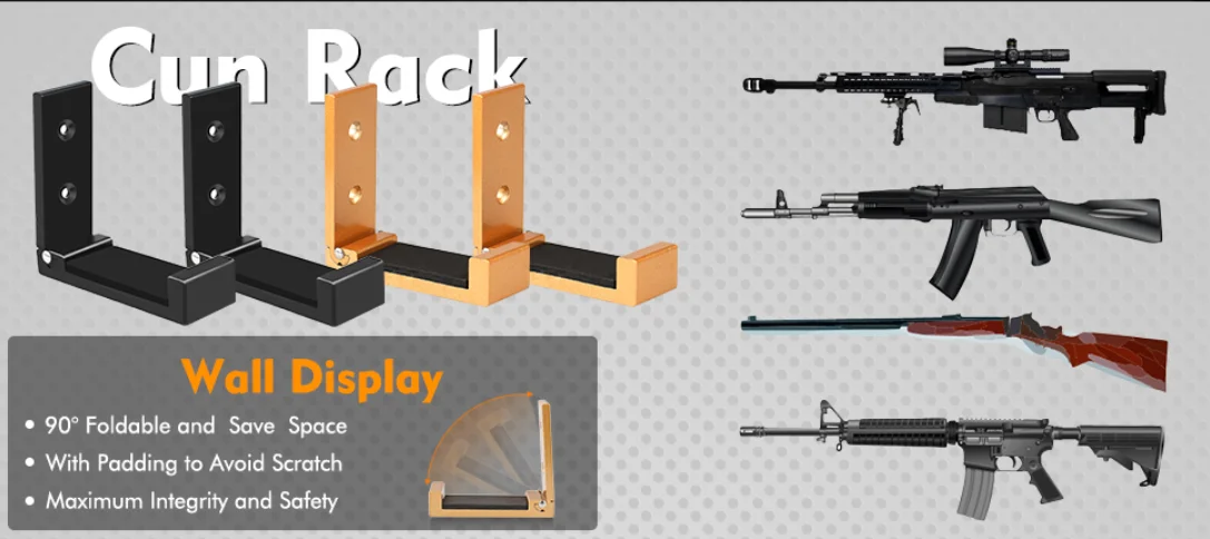 Gohiking gun rack изготовлен из прочного утолщенного пространства из алюминиевого сплава с хорошей отделкой, обеспечивая максимальную структурную целостность и безопасность. Обновленная конструкция со складной функцией, сложите плавно 90 °, откройте и закройте равномерно, свободно выдвигая. Откройте при использовании, сложите и храните, когда не используете, экономя пространство. В соответствии с эстетикой, оружие также практически предназначено для демонстрации для оценки, даже если вы не снимаете, наши оружейные стойки превратят Ваш пистолет в кусок «настенного искусства», сохраняя его в безопасности и звуке. Эта вешалка для пистолета подходит для AR15, AK47, M16, G36, MP5, AWP, M5, SVD и других дробовиков и пистолетов и т. д.