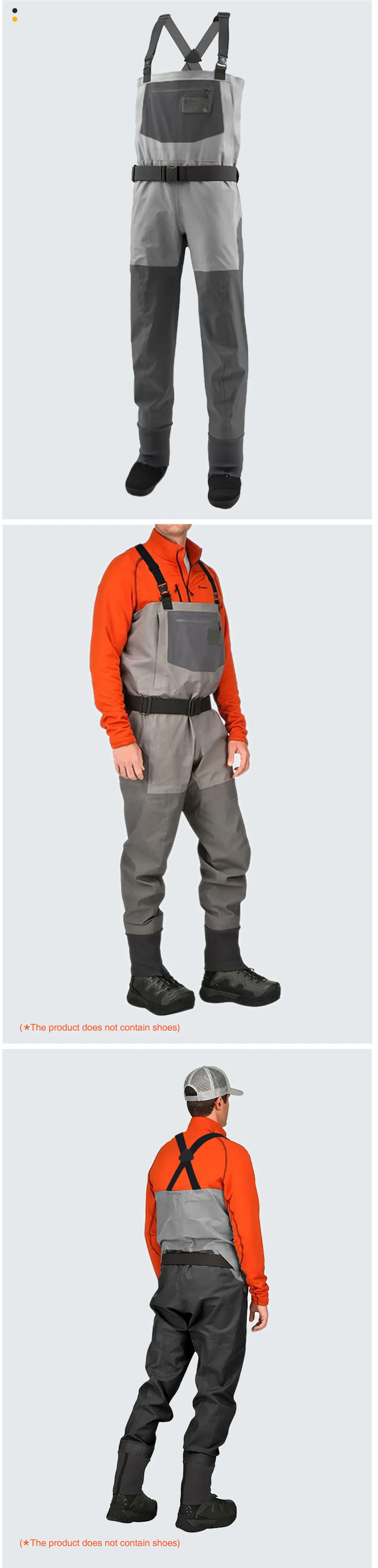 В 3 слоя, прочный, легкий, водонепроницаемый и воздухопроницаемая оболочка ткань делает вас комфортно и сухо. Регулируемая высота груди и обхват талии могут удовлетворить ваши потребности. На груди есть водонепроницаемые карманы на молнии, с неопреновыми носками, а на лодыжках есть петельные крючки, которые подходят для ботинок. Отличная производительность предназначена для защиты от повреждения воды в море, озерах, реках и болотах.