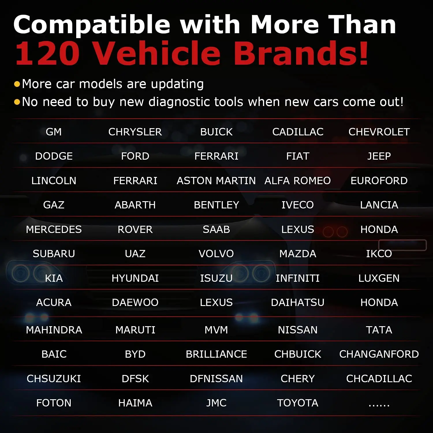 ☑Чтение и удаление кодов ошибок, отображение потока данных, Чтение информации о транспортном средстве. Для 120 + автомобильных брендов.