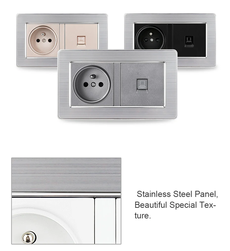 UNKAS серая панель из нержавеющей стали 16A французский стандарт розетка + серый RJ45 Интернет-компьютер разъем Jack 146 мм * 86 мм розетка