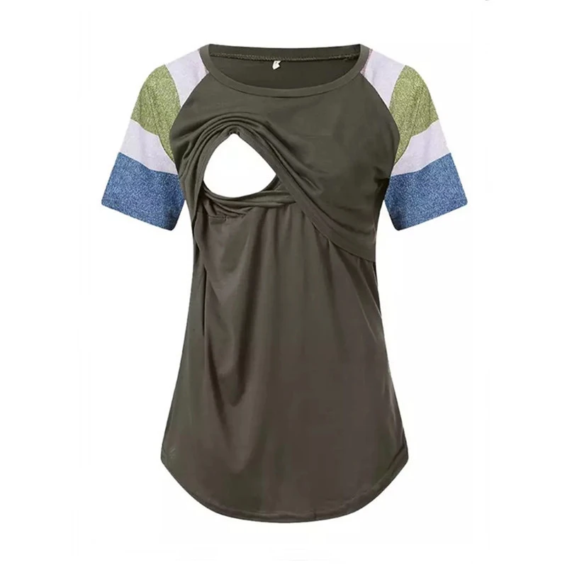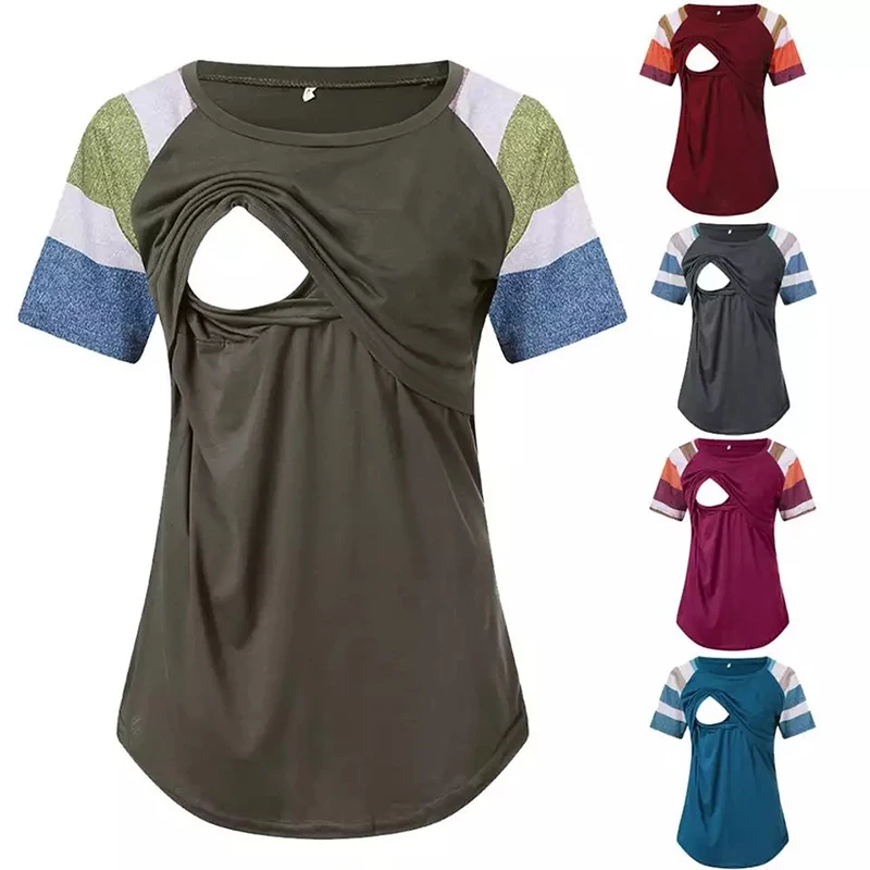 Женская блузка для беременных в полоску, Лоскутные Топы для кормящих, летняя футболка с коротким рукавом для беременных, одежда для кормящих мам, Camisa