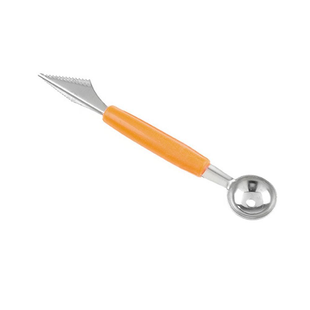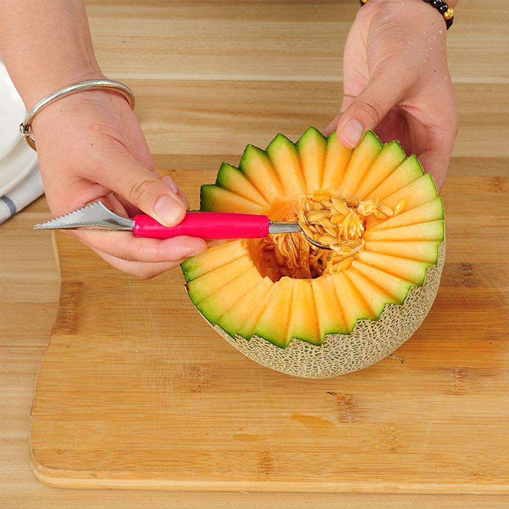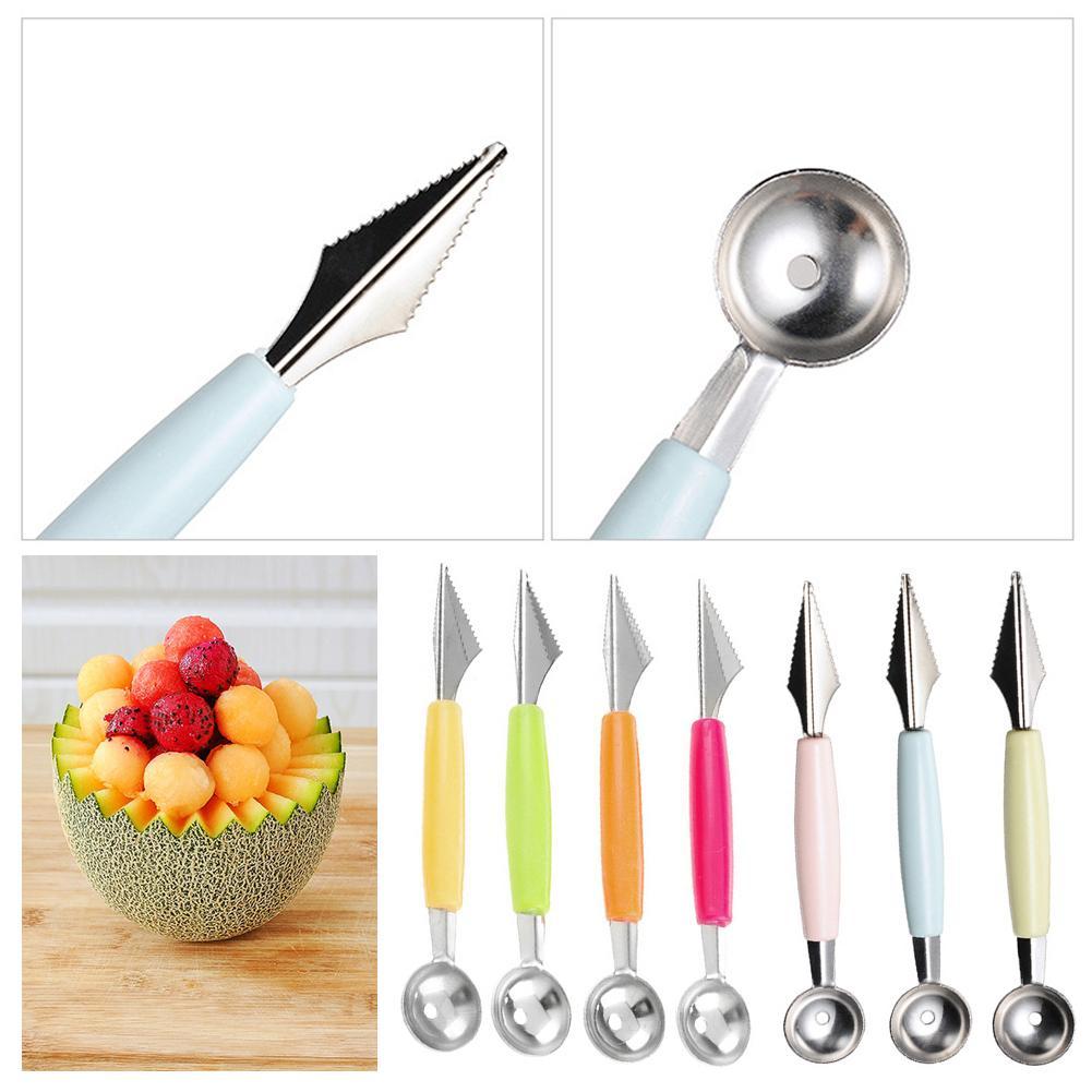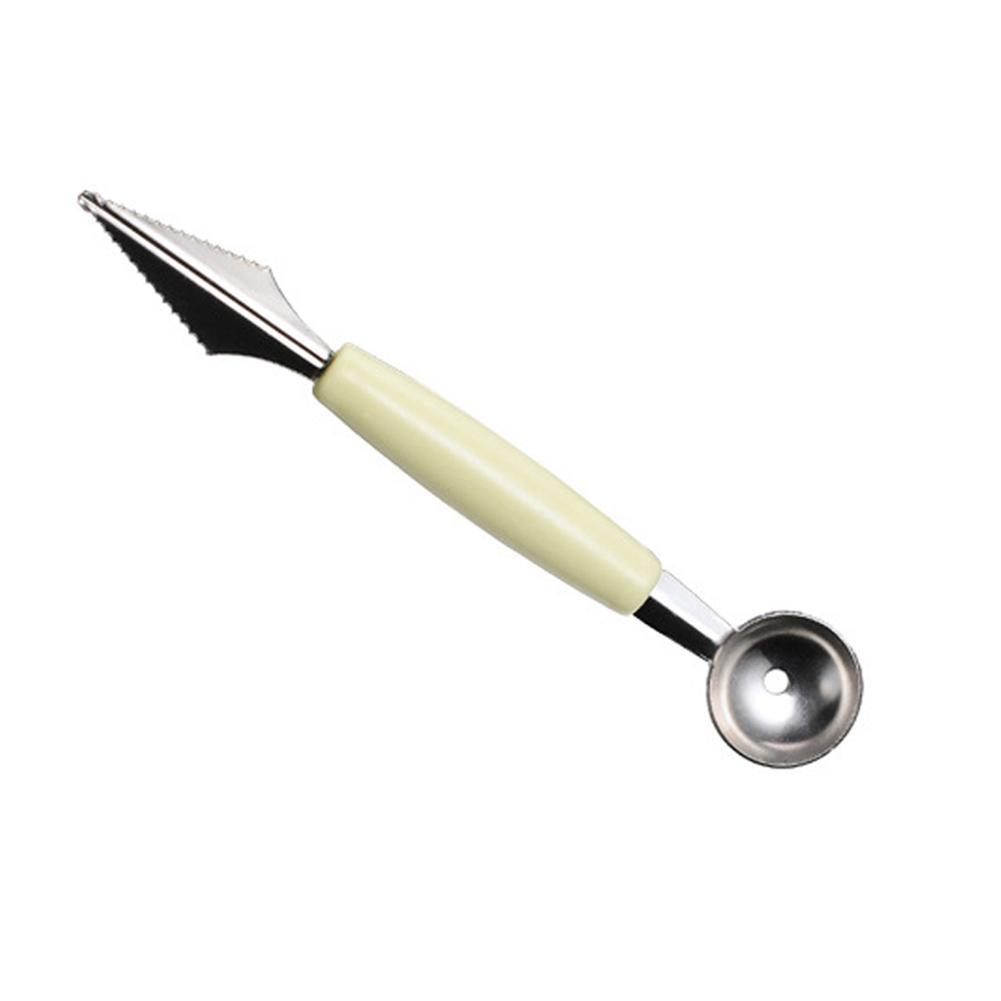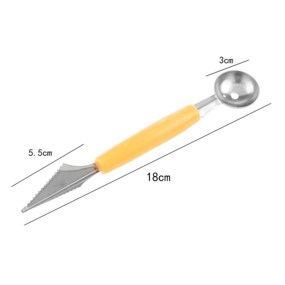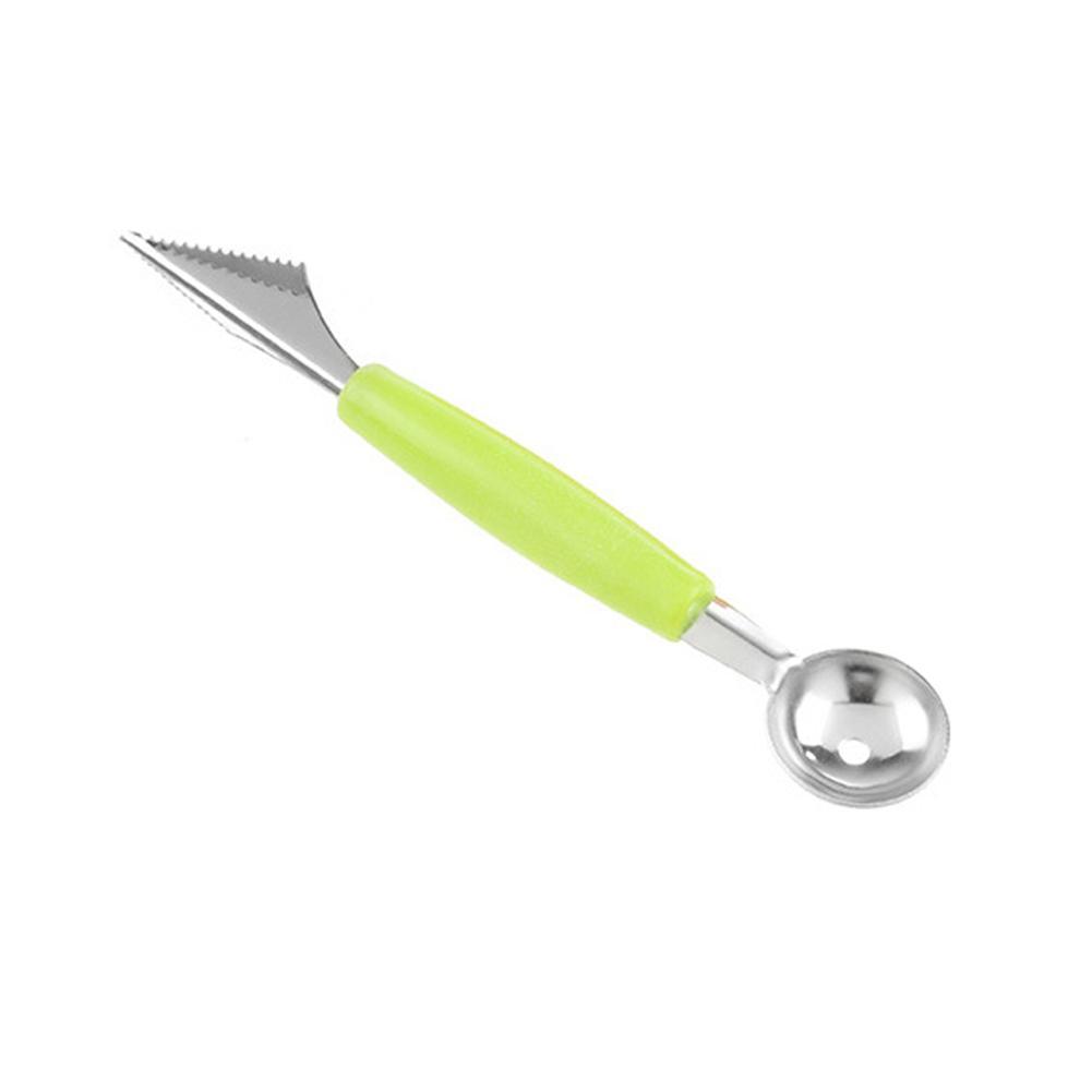 Изготовлен из высококачественной нержавеющей стали, он прочный, не легко ржавеет и легко чистится. Это может быть двойного назначения, один конец может быть вырезан, а другой конец-рыть фруктовые шарики, чтобы сделать домашнее фруктовое блюдо. Края ножа с волнистым узором, ручка из полипропиленового материала и головка ложки с круглыми отверстиями, которые пропускают воздух и легко Отпадают,-все это идеальный дизайн.