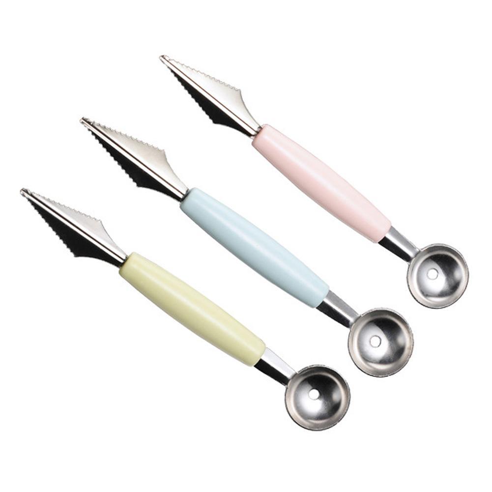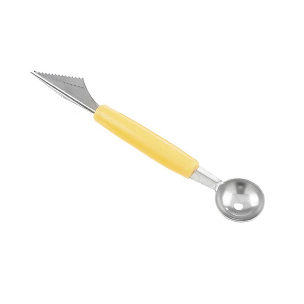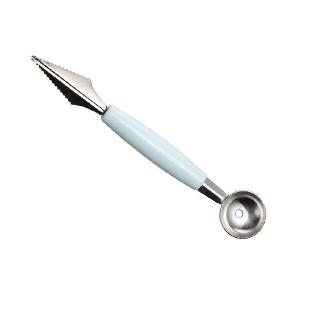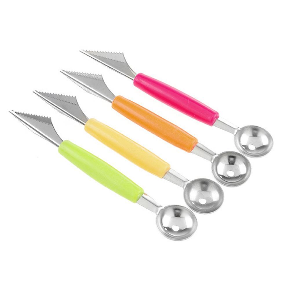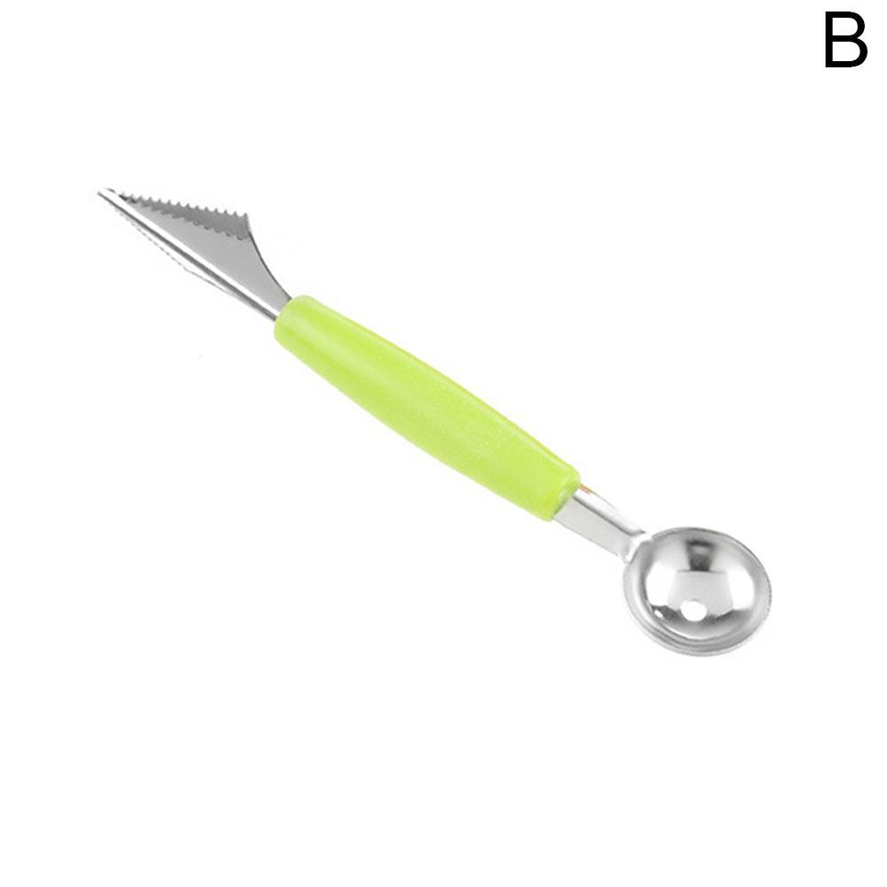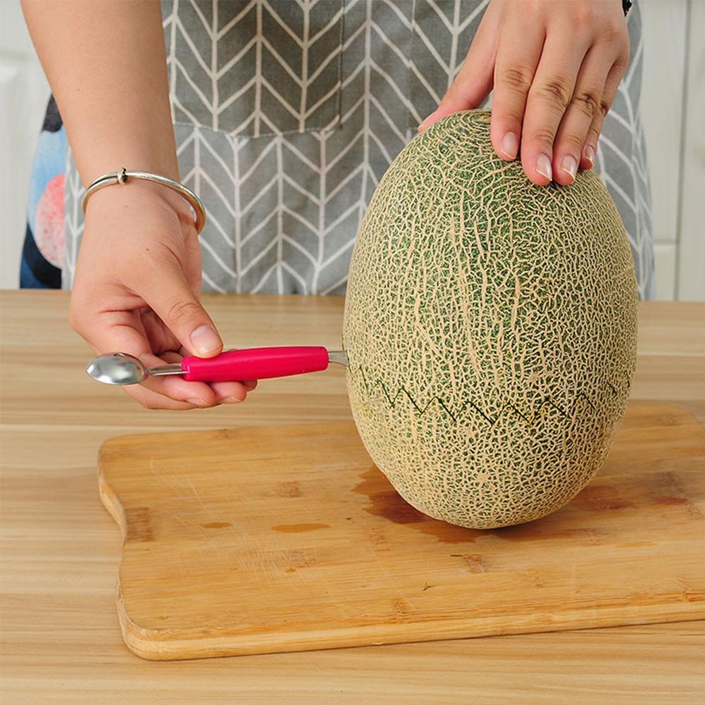 Изготовлен из высококачественной нержавеющей стали, он прочный, не легко ржавеет и легко чистится. Это может быть двойного назначения, один конец может быть вырезан, а другой конец-рыть фруктовые шарики, чтобы сделать домашнее фруктовое блюдо. Края ножа с волнистым узором, ручка из полипропиленового материала и головка ложки с круглыми отверстиями, которые пропускают воздух и легко Отпадают,-все это идеальный дизайн.