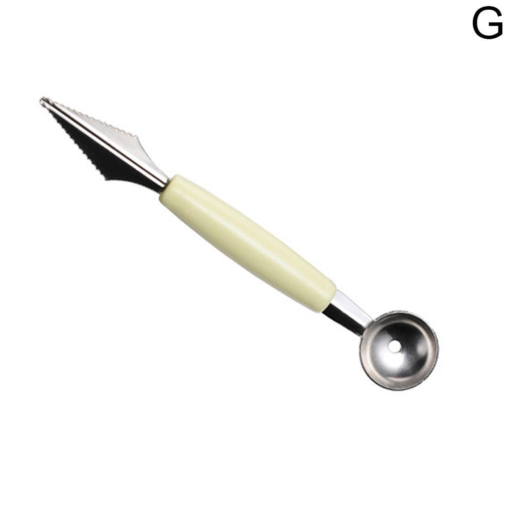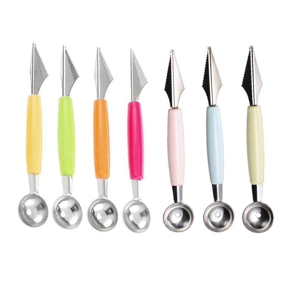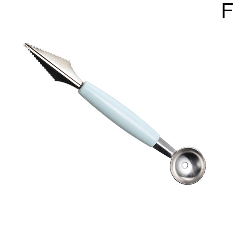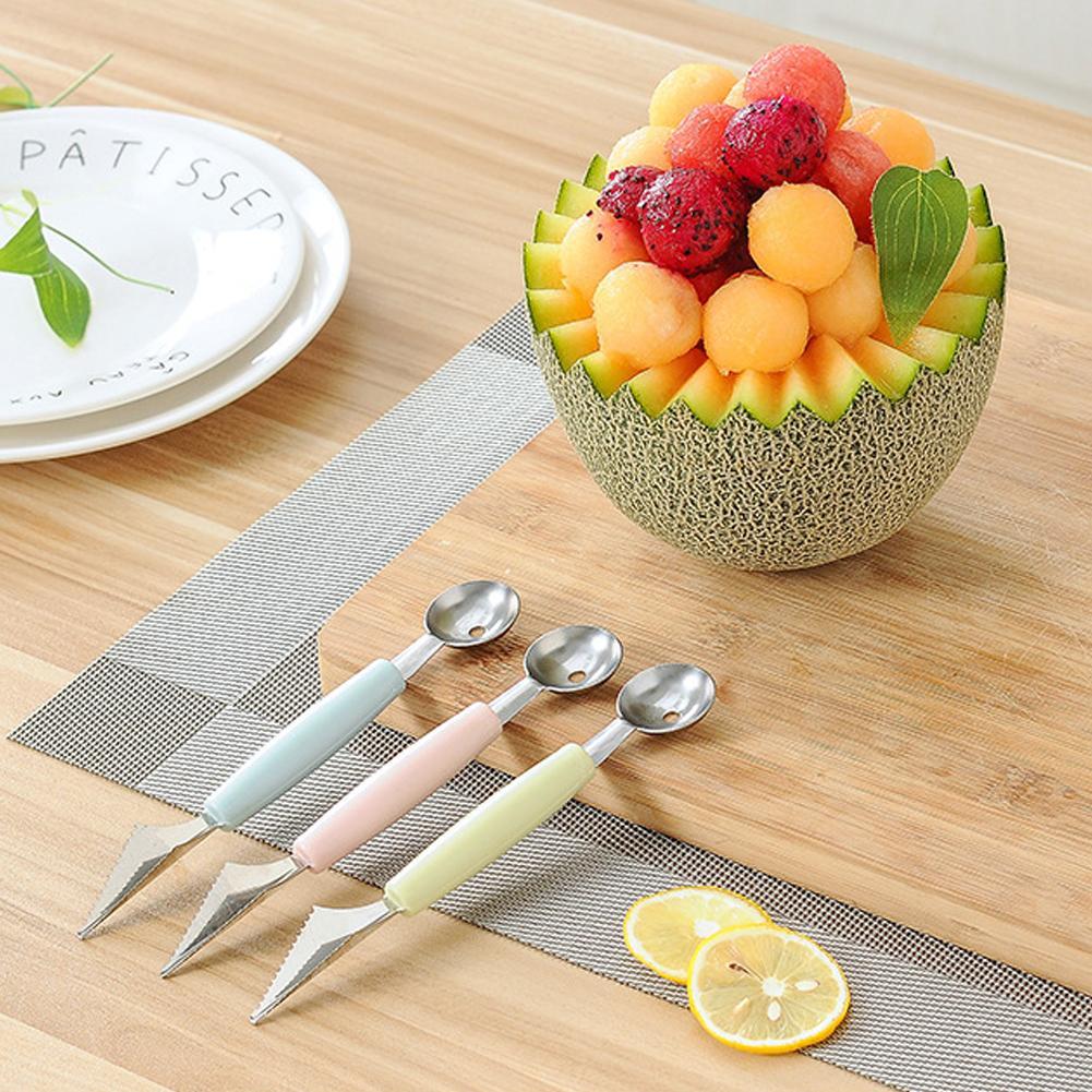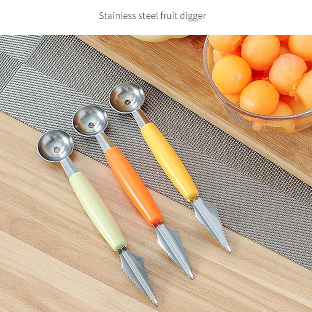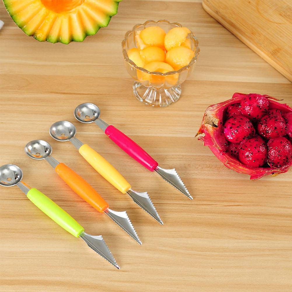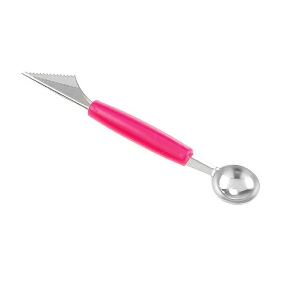 Изготовлен из высококачественной нержавеющей стали, он прочный, не легко ржавеет и легко чистится. Это может быть двойного назначения, один конец может быть вырезан, а другой конец-рыть фруктовые шарики, чтобы сделать домашнее фруктовое блюдо. Края ножа с волнистым узором, ручка из полипропиленового материала и головка ложки с круглыми отверстиями, которые пропускают воздух и легко Отпадают,-все это идеальный дизайн.