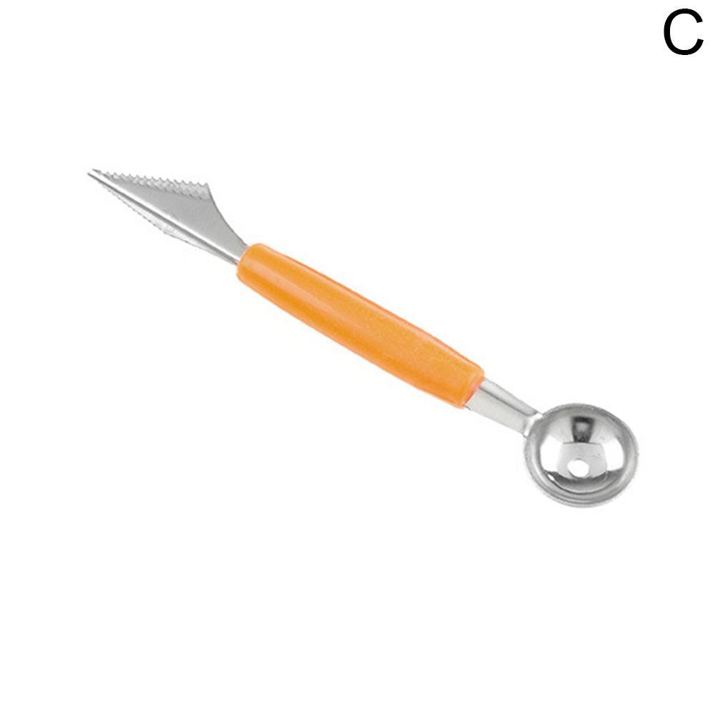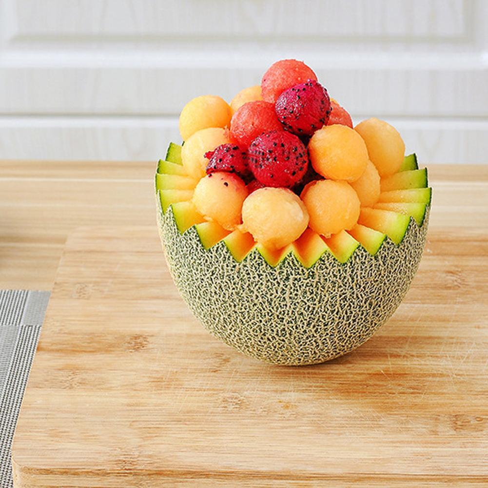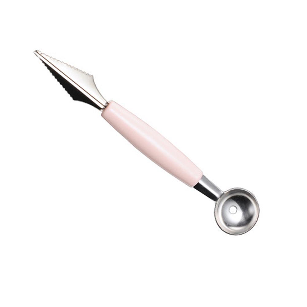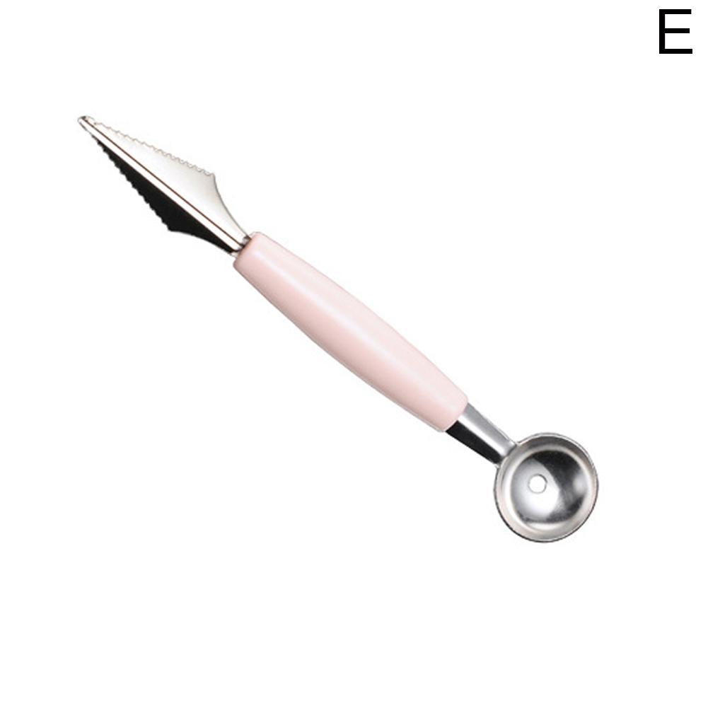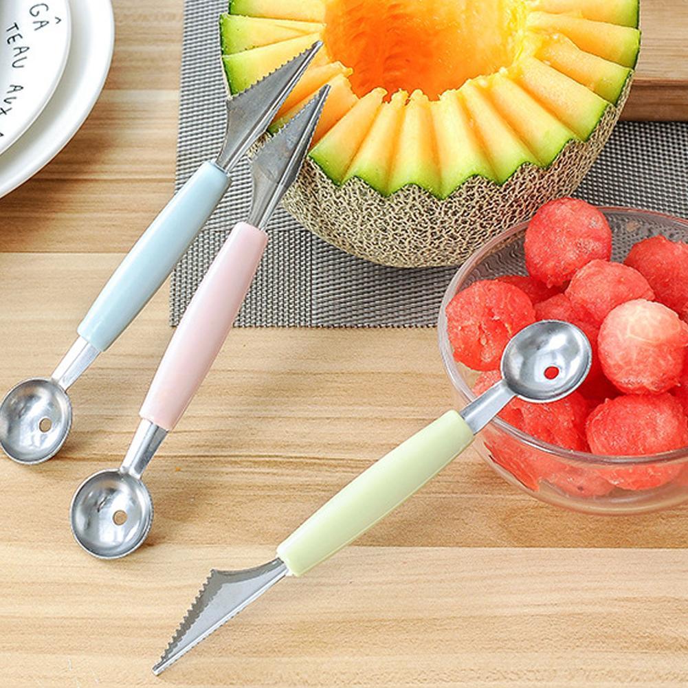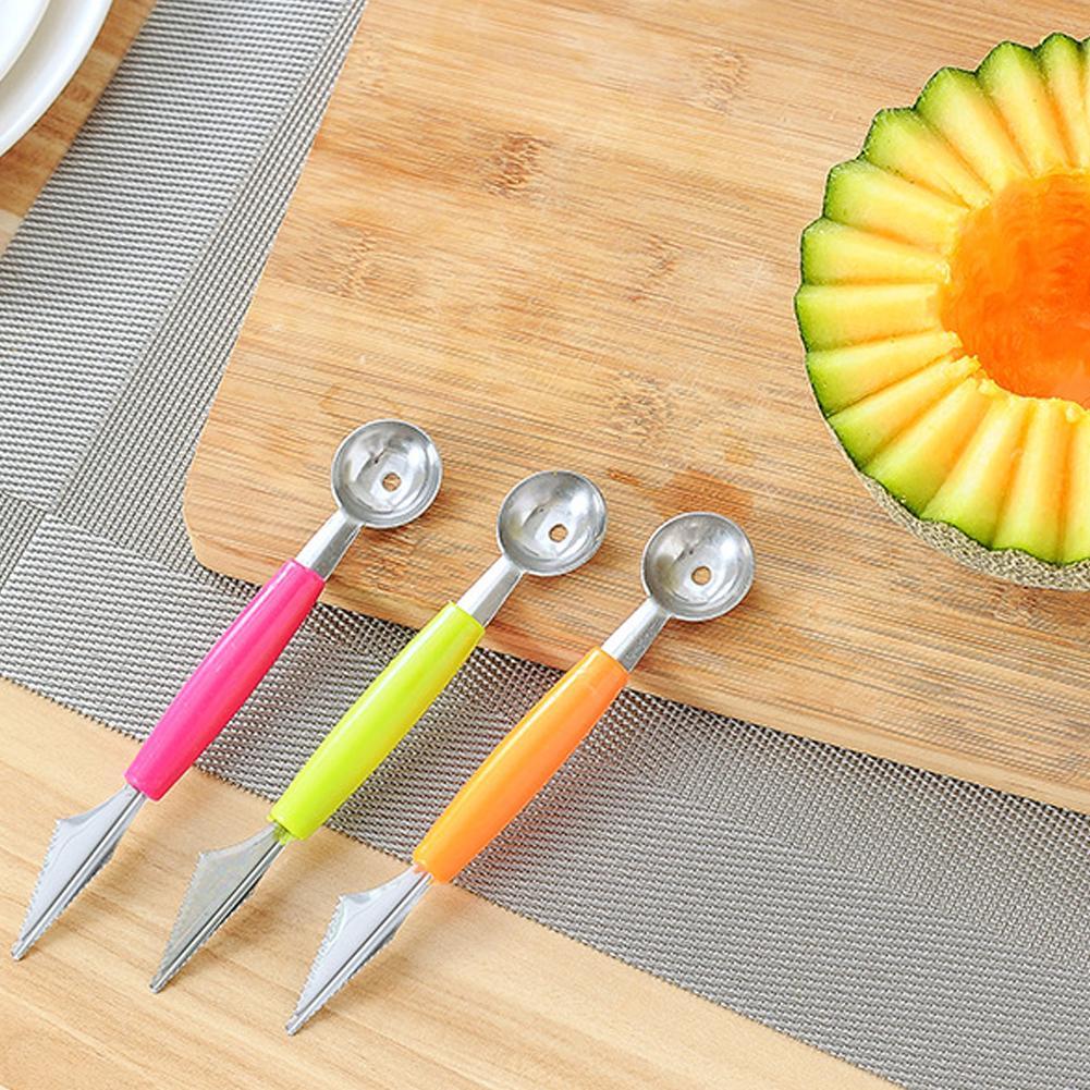 Изготовлен из высококачественной нержавеющей стали, он прочный, не легко ржавеет и легко чистится. Это может быть двойного назначения, один конец может быть вырезан, а другой конец-рыть фруктовые шарики, чтобы сделать домашнее фруктовое блюдо. Края ножа с волнистым узором, ручка из полипропиленового материала и головка ложки с круглыми отверстиями, которые пропускают воздух и легко Отпадают,-все это идеальный дизайн.