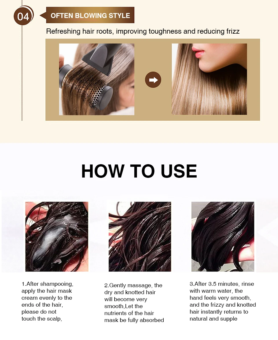 1. После мытья волос нанесите крем-маску равномерно на концы волос, пожалуйста, не прикасайтесь к коже головы,