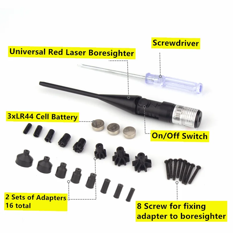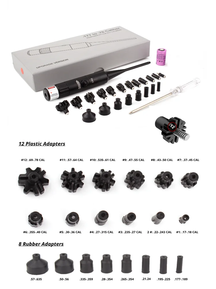 Этот набор sighter состоит из эмиттера, а также серьезных расширяемых адаптеров, которые покрывают все диаметры калибра от. 177 до. 50 дюймов.
