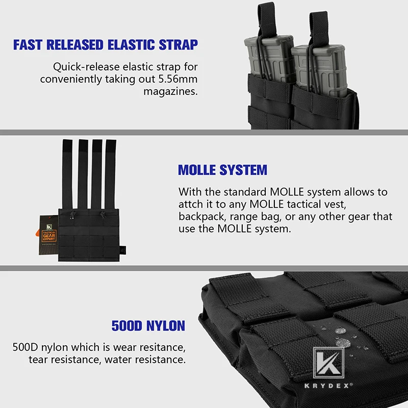 Чехол для журналов KRYDEX Double 5,56. 223 MOLLE для военной стрельбы, страйкбола, тактический, с открытым верхом, модульный, черный