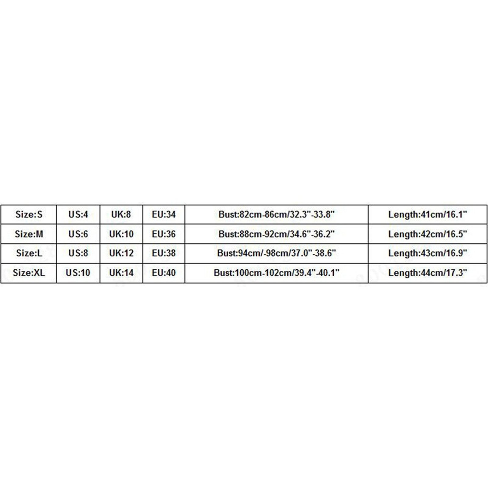 Размер США Великобритания ЕС Бюст Длина S 4. 8 34 82 см-86 см/32,3 ''-33,8'' 41 см/16,1'' М 6 10 36 88 см-92 см/34,6 ''-36,2'' 42 см/16,5'' L 8 12 38 94 см/-98 см/37,0 ''-38,6'' 43 см/16,9'' XL 10 14 40 100 см-102 см/39,4 ''-40,1'' 44 см/17,3''