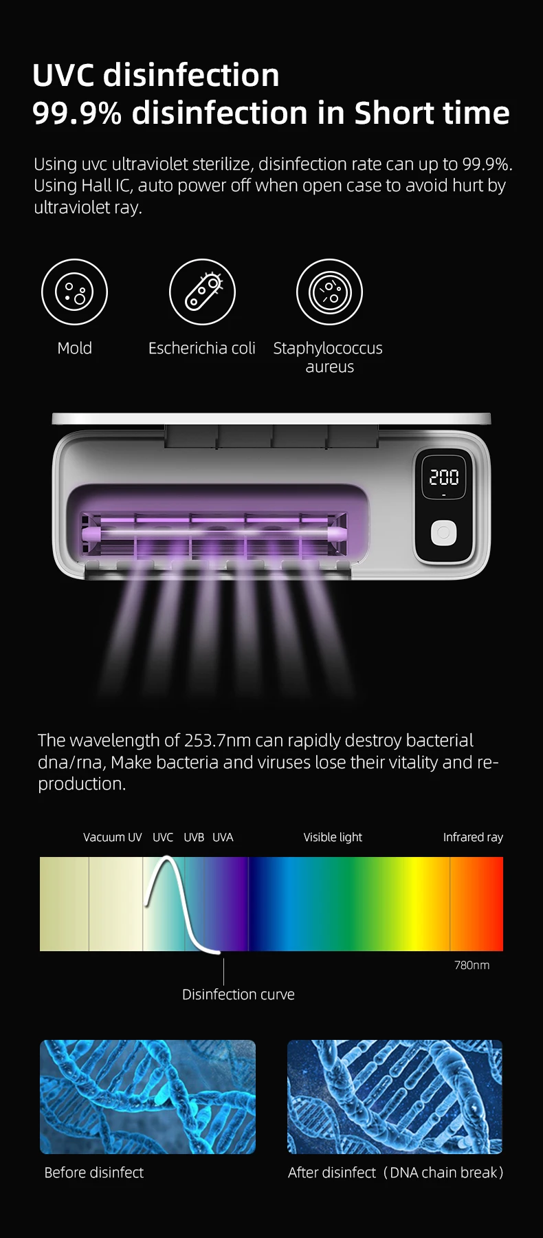 1. 99.9% sterilizing rate UV-C sterilization