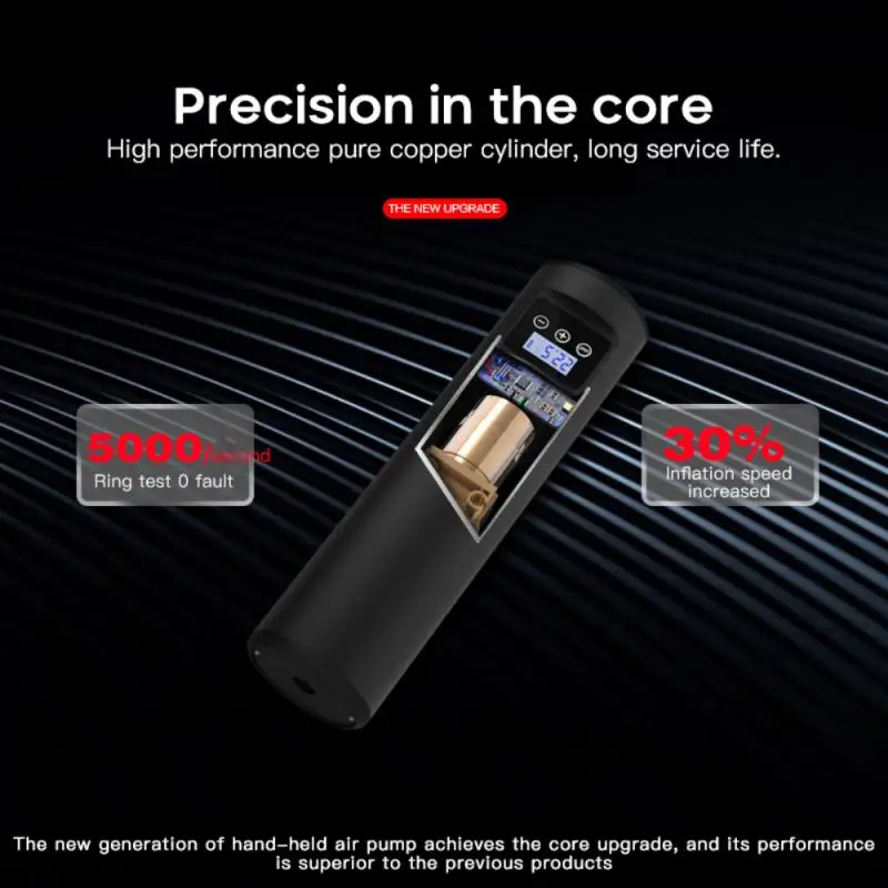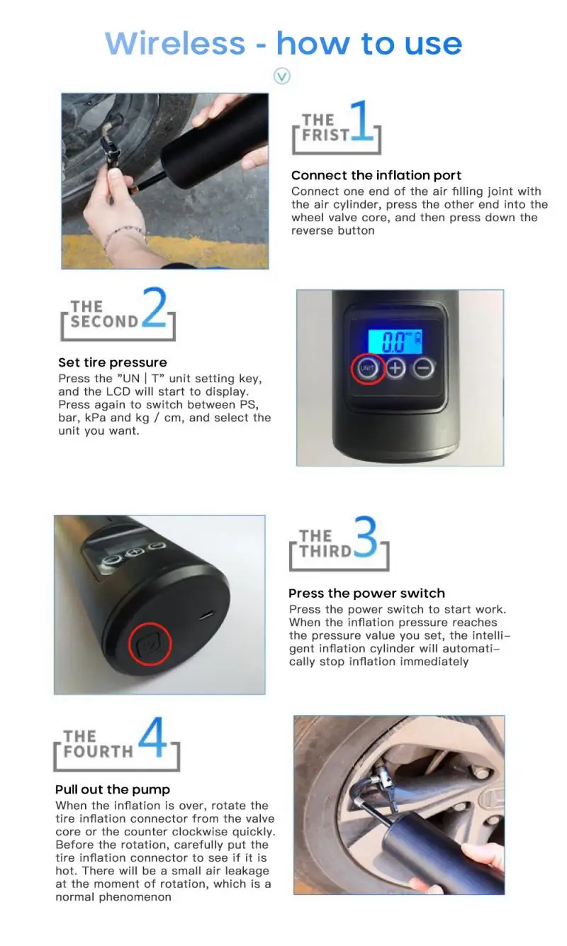 Беспроводной и портативный: беспроводной дизайн и компактный мини-размер делают воздушный компрессор портативным и простым в использовании одной рукой. Компрессор готов всего за 4 шага. ЖК-дисплей показывает давление воздуха. Подходит для накачивания, когда автомобильные шины недостаточны и полностью накачиваются шины для велосипедов и мотоциклов;