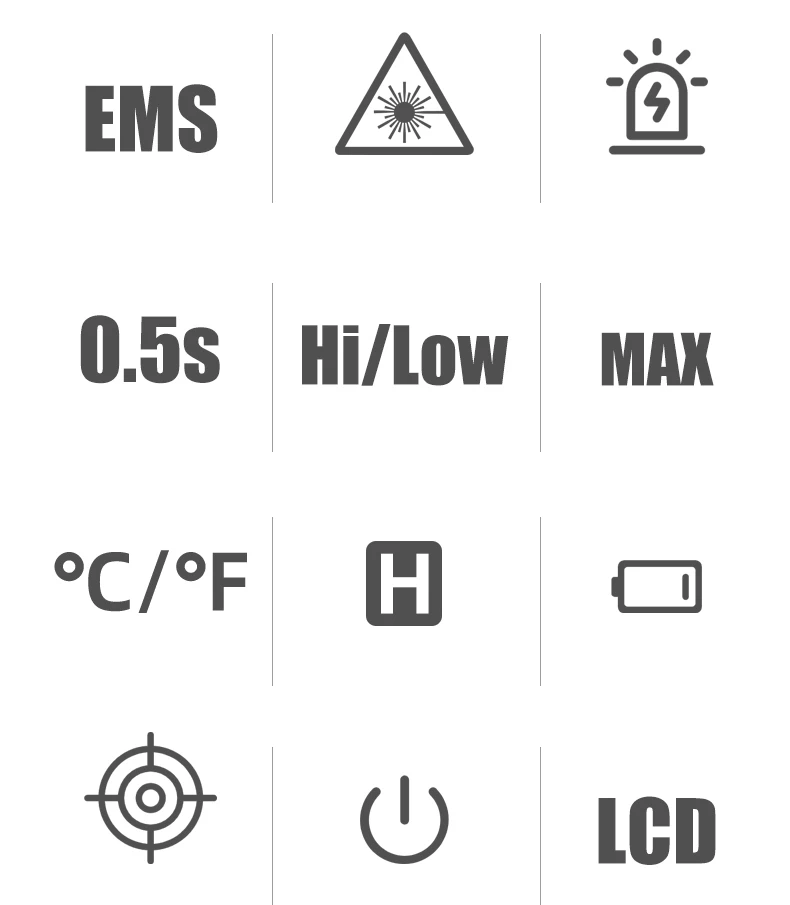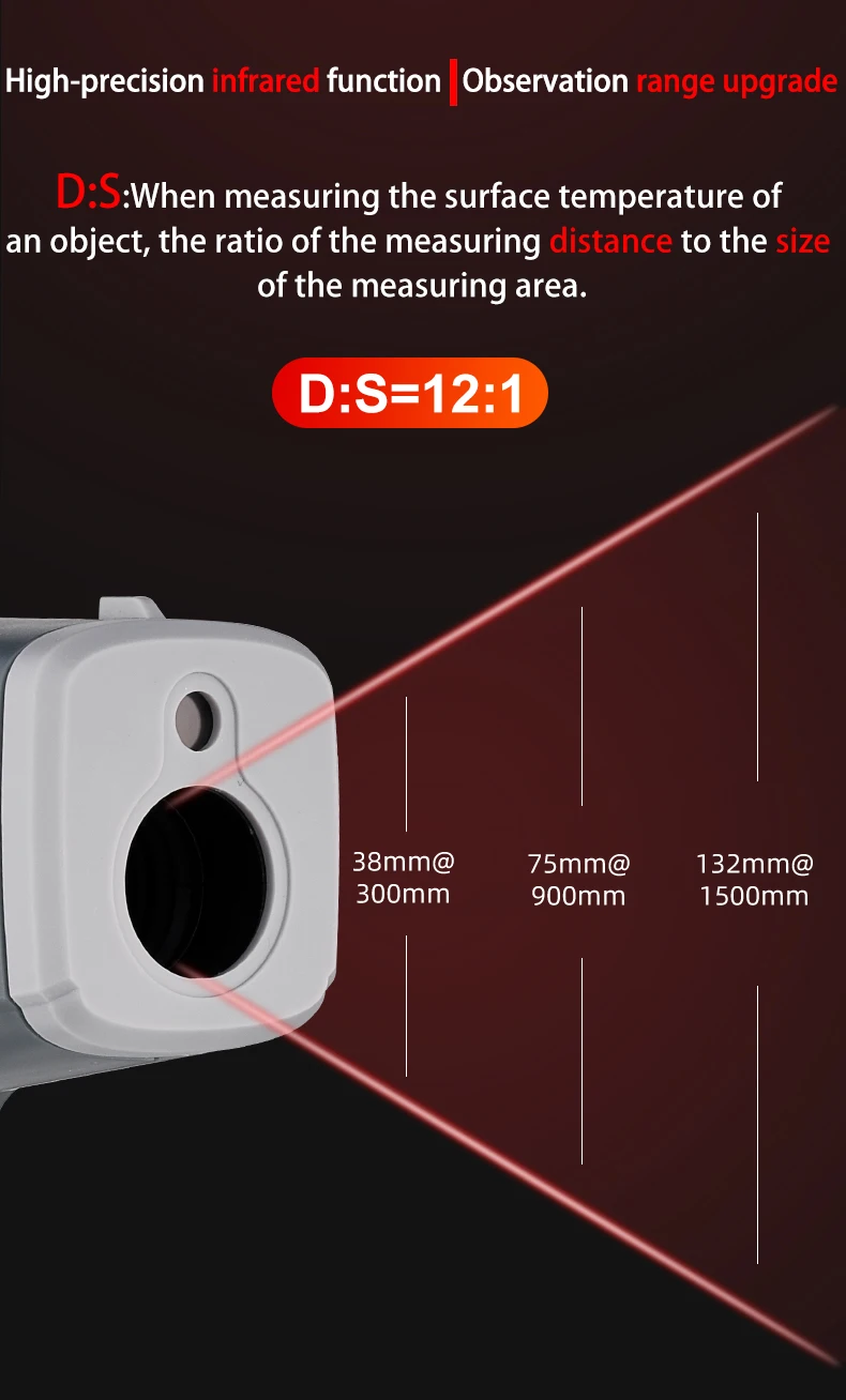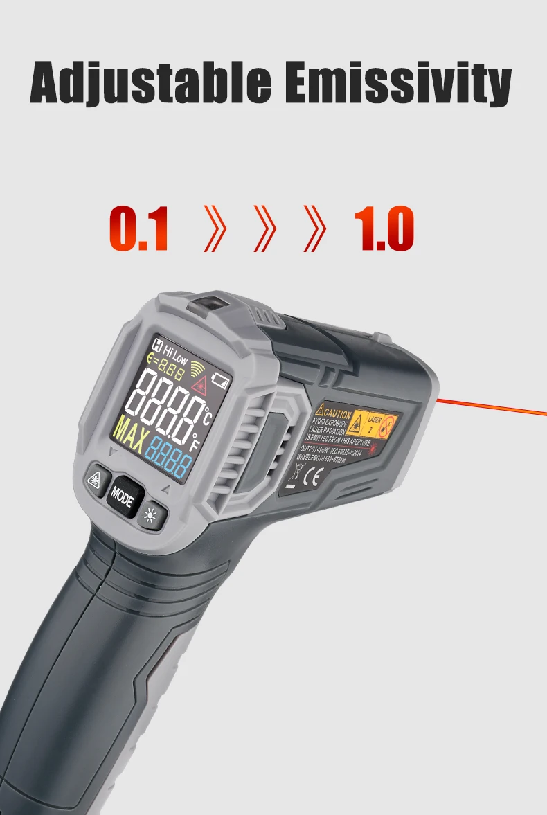 Характеристики: Модель: HT650A и HT650B Цвет: серый Материал: АБС-пластик Диапазон измерения температуры: HT650A:-50 ℃ ~ 380 ℃(-58 ℉ ~ 716 ℃) HT650B:-50 ℃ ~ 550 ℃(-58 ℉ ~ 1022 ℉) Точность: HT650A:-50 ℃ ~ 0 ℃(-58 ℉ ~ 32 °F):± 3 ℃ HT650B:-0 ℃ ~ 550 ℃(-22 ℉ ~ 1022 ℉):±(1.5% + 2 ℃) Излучение: 0,1 ~ 1,00 D:S:12:1 Лазерная указка:<1 мВт/630-670нм Уровень 2 Спектральная Характеристика: 8 ~ 14 мкм ℃/℉: Да Дисплей: цветной ЖК-дисплей Время отклика: <0,5 сек Предельная сигнализация температуры: Да Хранение данных: Да Автоматическое выключение: Да (30 сек) Макс: Да Индикация низкого заряда батареи: Да Питание: 2x1,5 V AAA Батарея (Батарея не прилагаются во время упаковки) Вес: около 100 г Размер: 145x92x45 мм Примечание: ● Не поставляется с батареями ● Внимательно прочитайте руководство пользователя перед использованием Упаковочный лист: ● 1 Инфракрасный термометр ● 1 тканевый мешок ● Руководство пользователя (на английском языке)-1 шт.
