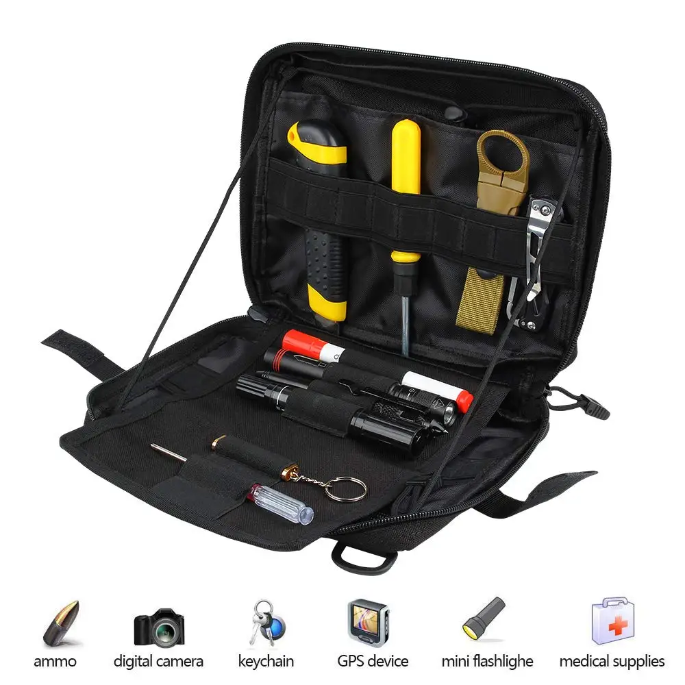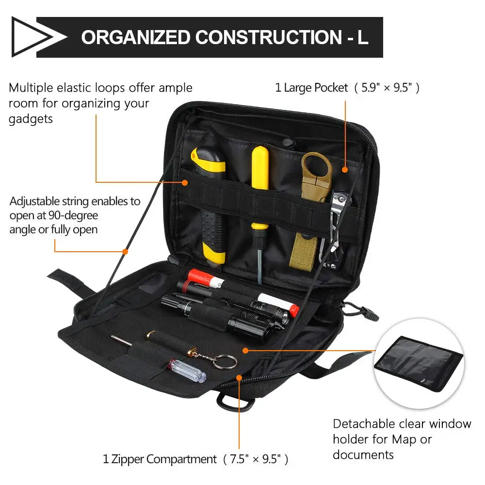 1. Изготовлен из прочного нейлона 1000D и внутренней поверхности изготовлены из водонепроницаемого материала. 2. Тактический пакет имеет 2 больших кармана, которые помогут вам хранить больше товаров в безопасности. Эластичные петли и держатели инструментов в мешке подходят для многих инструментов. 3. Сумка с креплением molle с 2 ремешками с пряжкой/4 ремешками с пряжкой (L) на спине может быть прикреплена к тактическому рюкзаку, боевой жилет или другие тактические шестерни в качестве дополнительного внешнего мешка или носить его как обычный мешочек для безопасности основных передач. 4. Утилита molle Чехол с двухсторонними молниями в бесшумном шнуре тянет позволяет быстро застегнуть военный мешочек с обеих сторон или получить доступ к только одной стороне тактического пакета, не полностью открывая его. 5. Основной отсек, внутренний карман и эластичные петли идеально подходят для хранения сотового телефона, тактической ручки, брелка, gps-устройства, цифровых камер, медицинских принадлежностей, патронов, паракордов или любых необходимых гаджетов, которые вам нужны.
