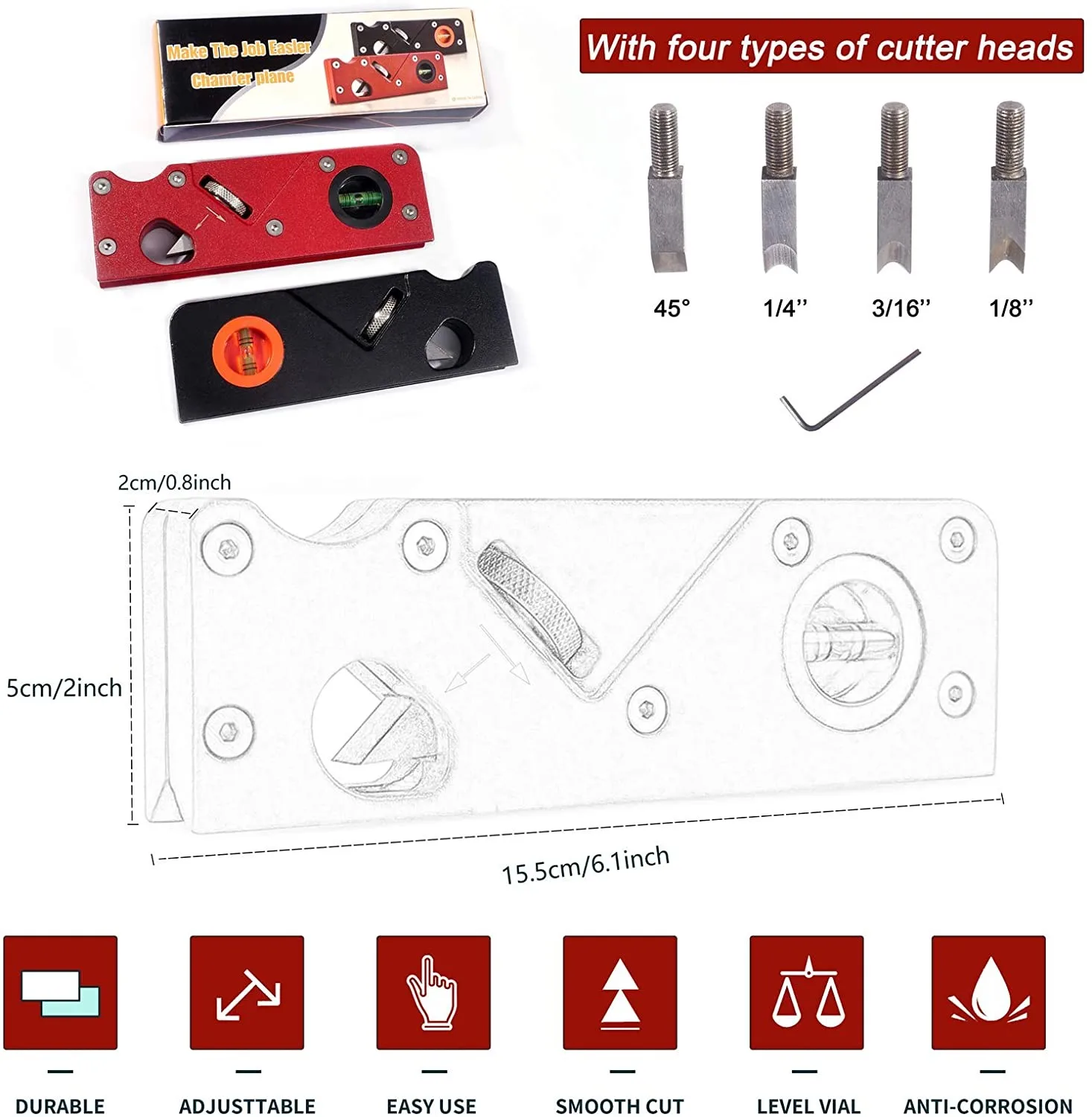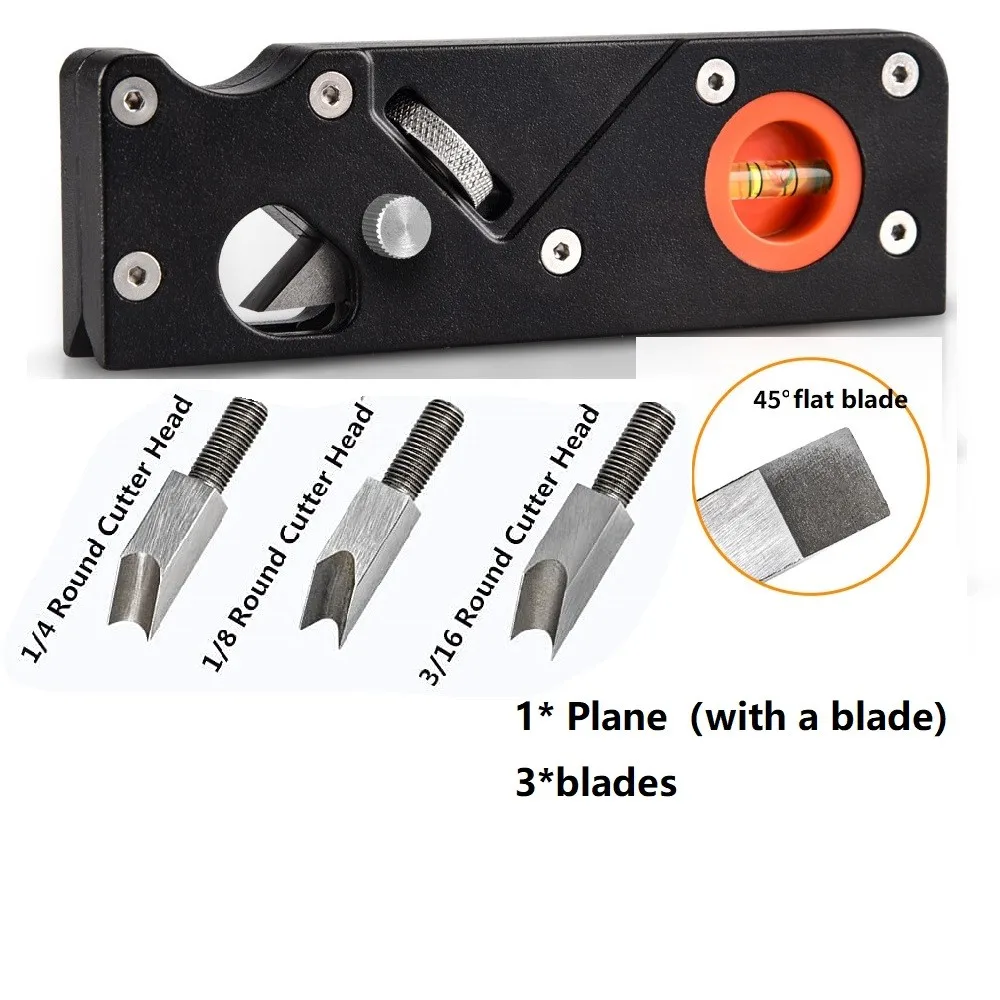 Посылка 2: 1 * самолет + 3 * лезвия (с плоским лезвием 45 °; 1/4 круглая режущая головка; 1/8 круглая режущая головка; 3/16 круглая режущая головка)
