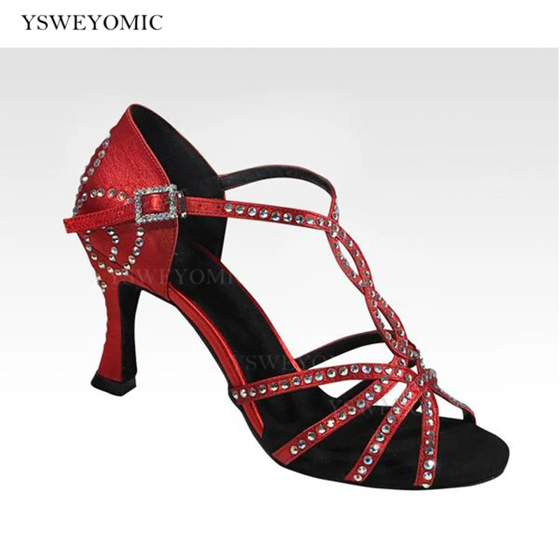 Новинка 2021 года; Летняя стильная обувь для сальсы; Мягкая Толстая стелька; Цвет черный, бронзовый, красный; Атласная обувь для танцев с кристаллами; Женская обувь для латинских танцев