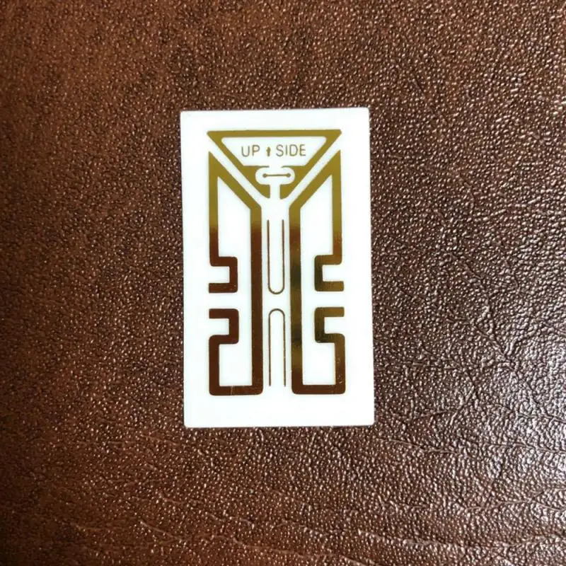 2. Оторвите белую клейкую ленту позади сигнальной наклейки и наклейте ее вертикально на заднюю часть мобильный телефон, С английскими буквами лук и стрелы конец облицовочные вверх (в том случае, если есть пленка на заднюю часть мобильный телефон, она должна быть порвана, в противном случае, нет эффекта);