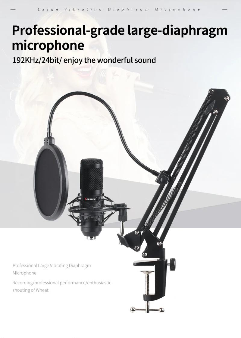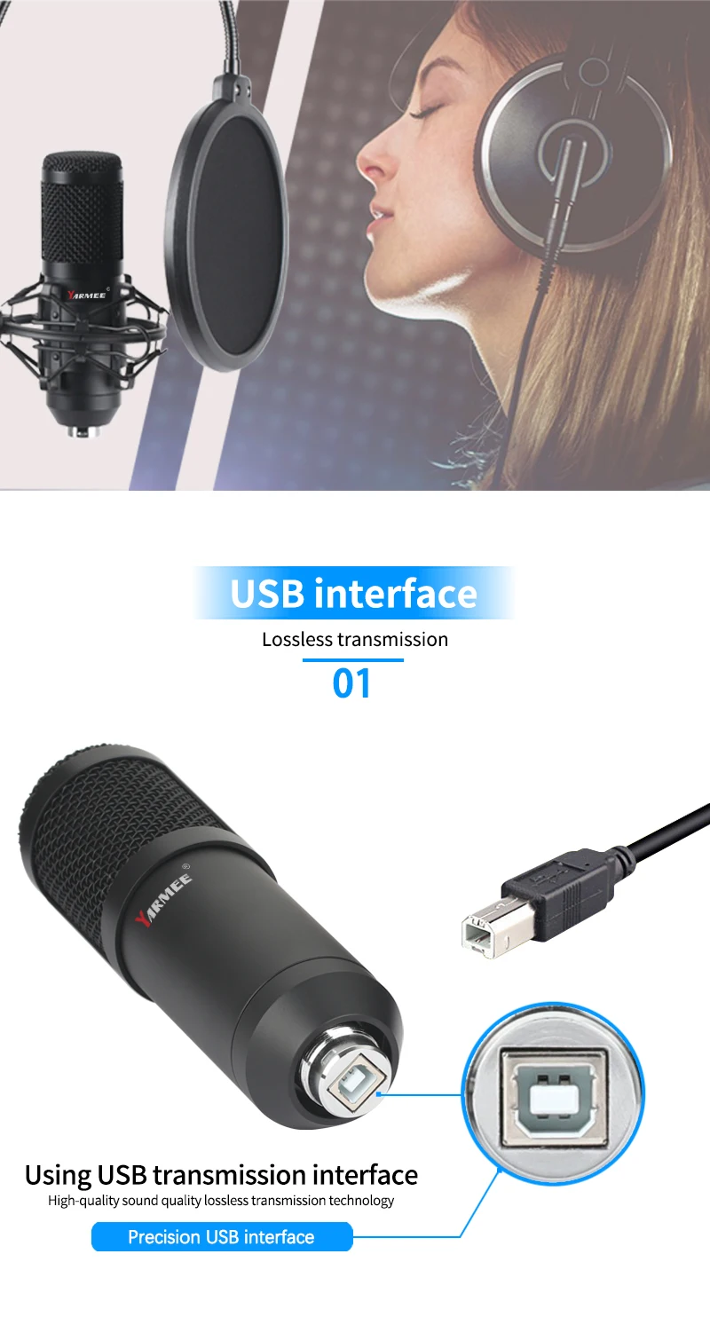 С помощью USB-терминала для питания конденсаторный микрофон не нуждается в звуковой карте или других вспомогательных устройствах. Комплект микрофона может подключаться к компьютерному устройству, ноутбуку, зарядному устройству адаптера переменного тока.