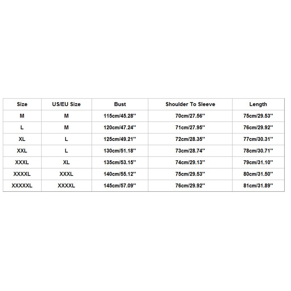 Размер Размер США/ЕС Бюст От плеча до рукава Длина М М 115 см/45,28'' 70 см/27,56'' 75 см/29,53'' L М 120 см/47,24'' 71 см/27,95'' 76 см/29,92'' XL L 125 см/49,21'' 72 см/28,35'' 77 см/30,31'' XXL L 130 см/51,18'' 73 см/28,74'' 78 см/30,71'' XХХL XL 135 см/53,15'' 74 см/29,13'' 79 см/31,10'' XXXXL XХХL 140 см/55,12'' 75 см/29,53'' 80 см/31,50'' XXXXXL XXXXL 145 см/57,09'' 76 см/29,92'' 81 см/31,89''