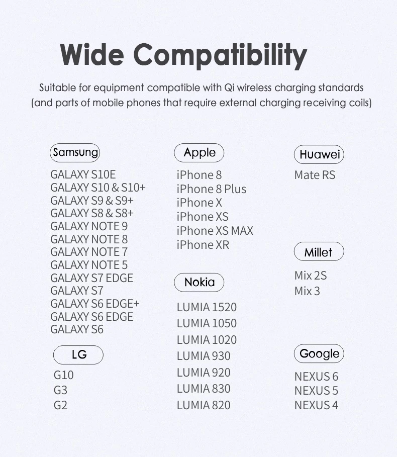 Быстрая Беспроводная зарядка: режим быстрой зарядки 10 Вт совместим только с Samsung Galaxy S9/S9 Plus/S8/S8 Plus/Note 9/Note 8/Note 5/S6 Edge/S7/S7 Edge и другие продукты серии Galaxy Note и Galaxy S, 7,5 Вт Быстрая зарядка совместима с iPhone X/XS MAX/XR, iPhone8/8 plus (Другие устройства с поддержкой Qi будут заряжаться со стандартной скоростью беспроводной зарядки).