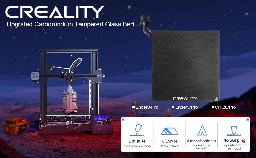 Стеклянная платформа Creality Carborundum (строительная пластина из закаленного стекла) закалена до 9 МОЗ, лучше, чем алюминий и медь, высокая твердость и долговечность. Он устойчив к 400 °C и не ухудшается в производительности при повторном использовании. Это один из необходимых обновленных аксессуаров для 3D принтеров.