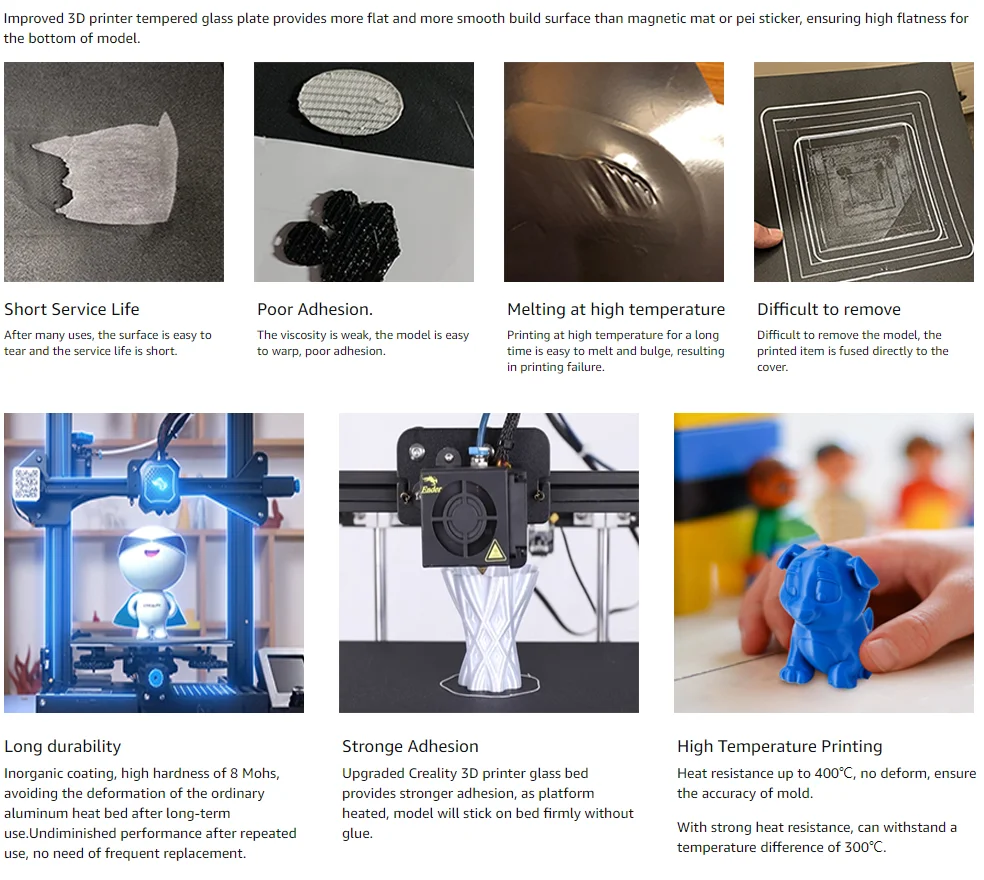 По сравнению с другими платформами печати, такими как магнитная поверхность сборки, листы ПЭ и пружинные стальные пластины, Ender 3 стеклянная кровать имеет самую высокую плоскость. Добавляя микропористое покрытие сверху, это значительно улучшает его производительность, чтобы получить более точные штампы.