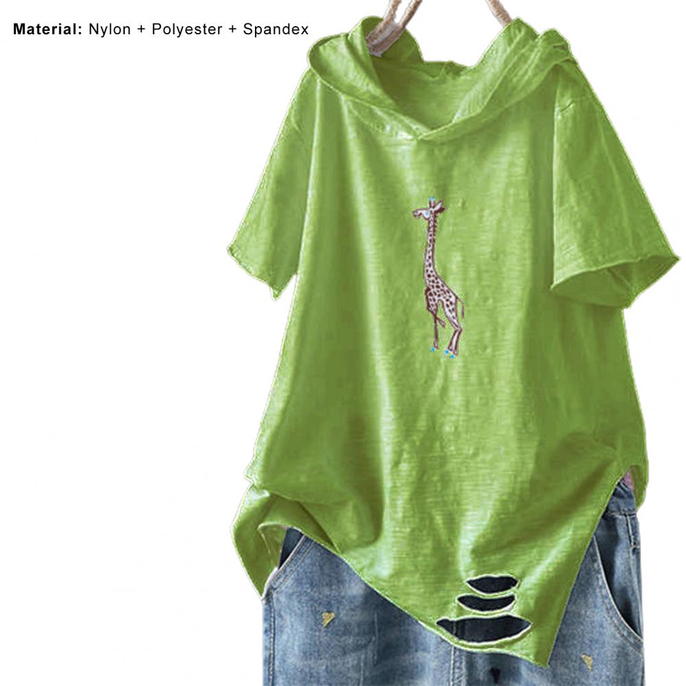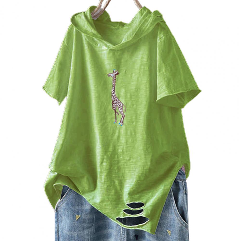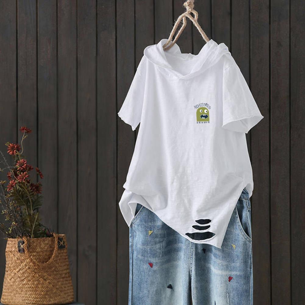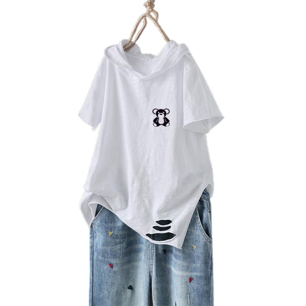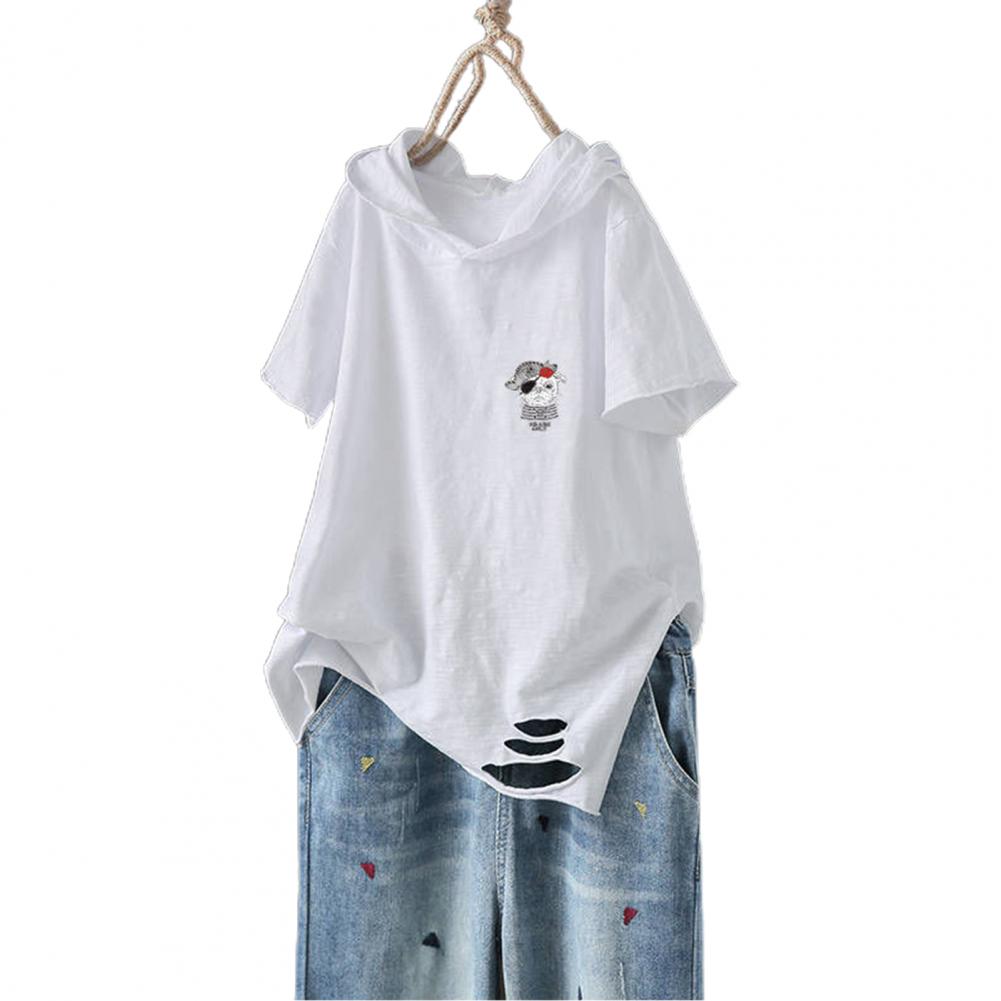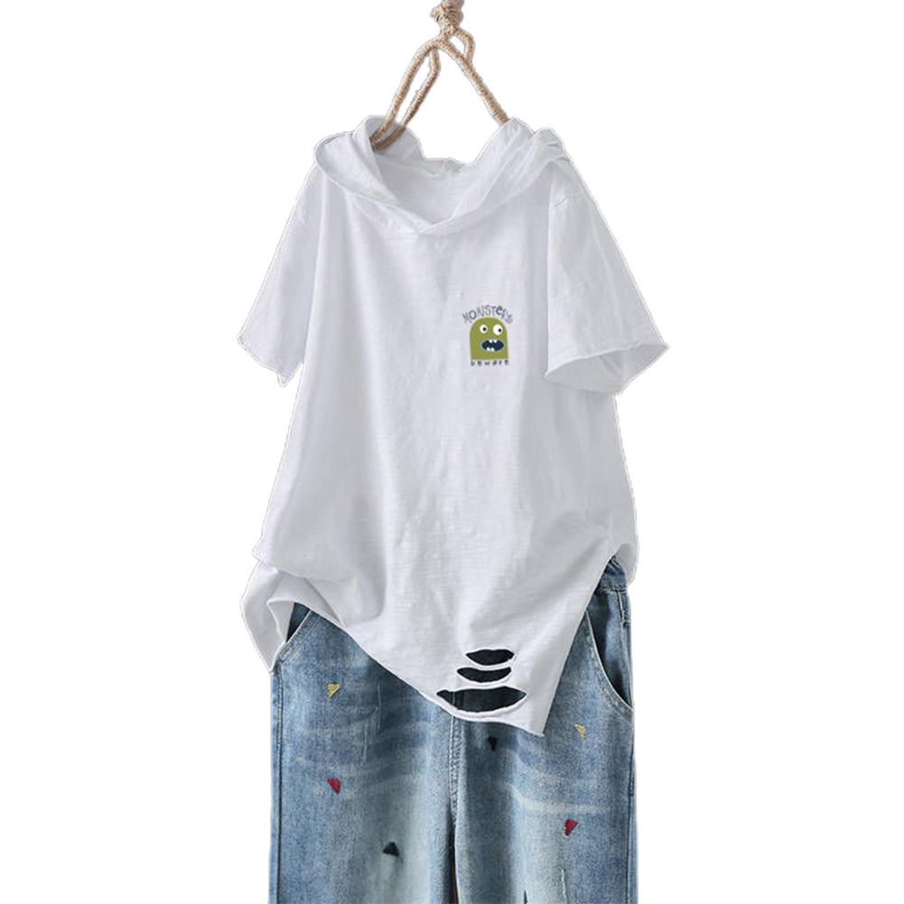 Рисунок с принтом выглядит мило и интересно. Повседневная Свободная футболка с рваными дырками и капюшоном.