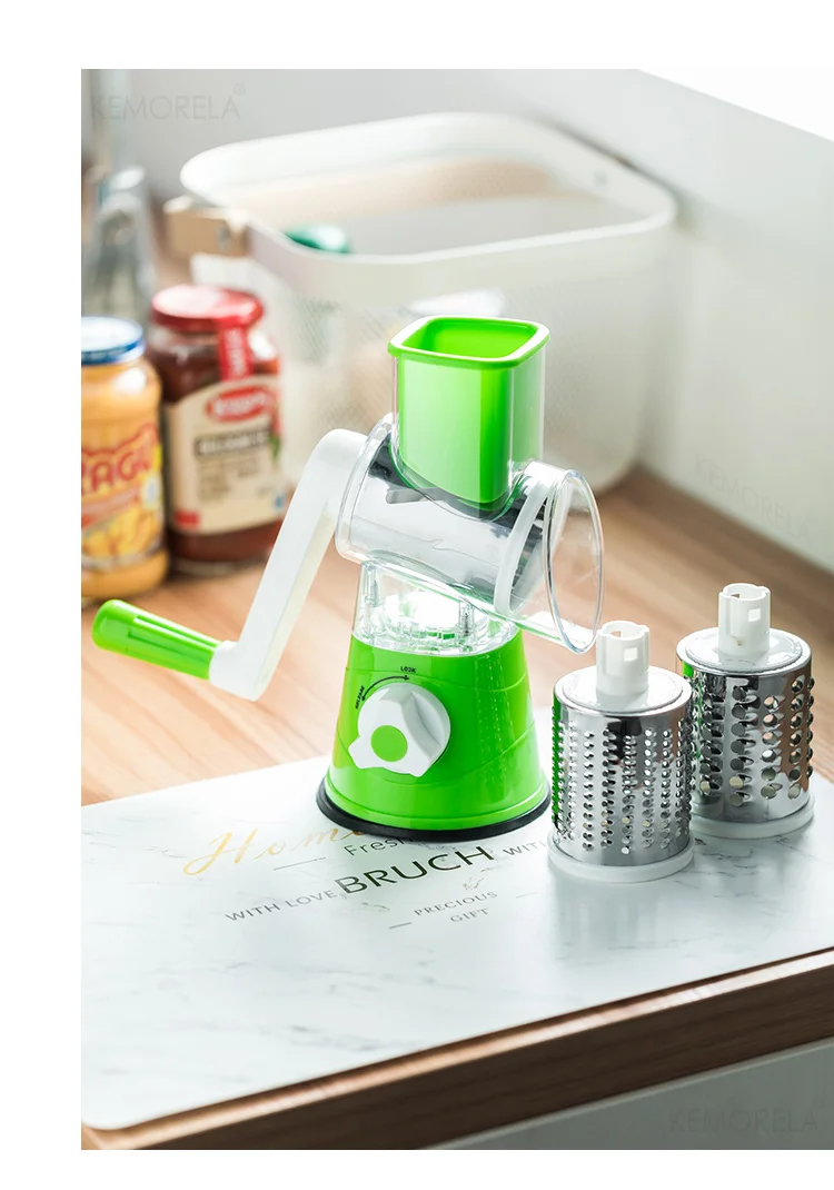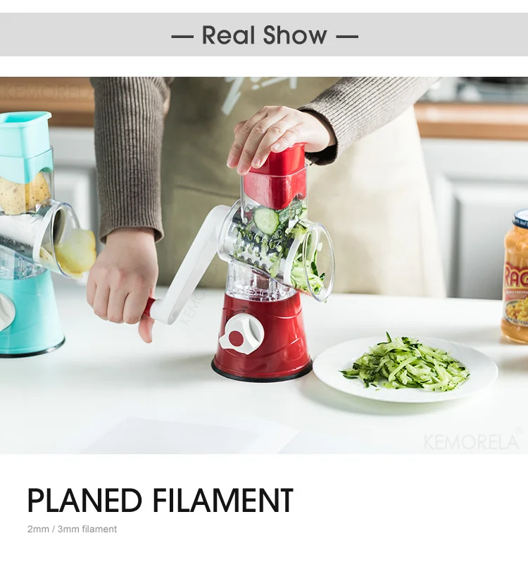 Крепкая присоска прочно закреплена на столе, и еду можно вставить из порта подачи. При встряхивании ручки одно вращение эквивалентно 12 раз порезу. Еда быстро и равномерно разрезается, поэтому вам не придется беспокоиться о том, что вы повредите руки в процессе. Ломтики расположены по диагонали, поэтому рубленые кусочки упадут с овощерезки без засорения. Три роликовых лезвия могут удовлетворить ваши различные потребности!