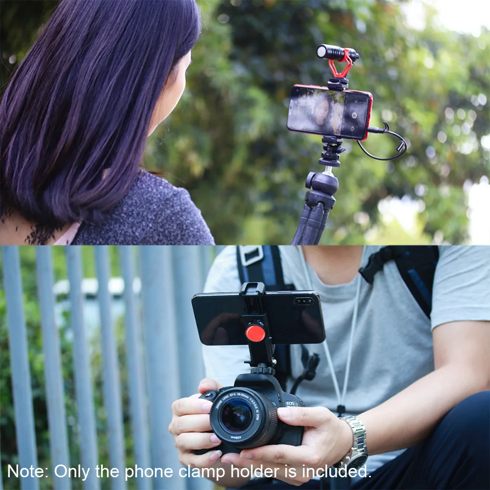 360 градусов вращающийся зажим для телефона для горизонтальной и вертикальной съемки, вперед и назад регулировка наклона также доступна.
