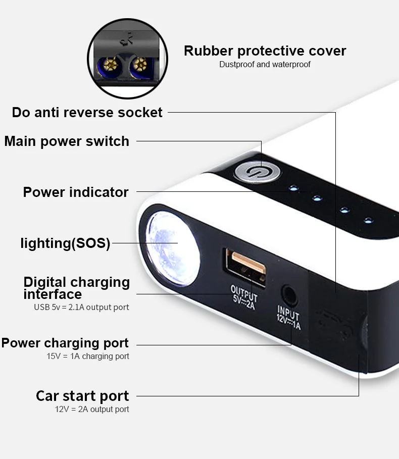 1. Подключите зажимную вилку плотно, чтобы перейти к стартеру 2. Подключите зажимы к автомобильному аккумулятору (красный для +, черный для-) 3. Запустите транспортное средство
