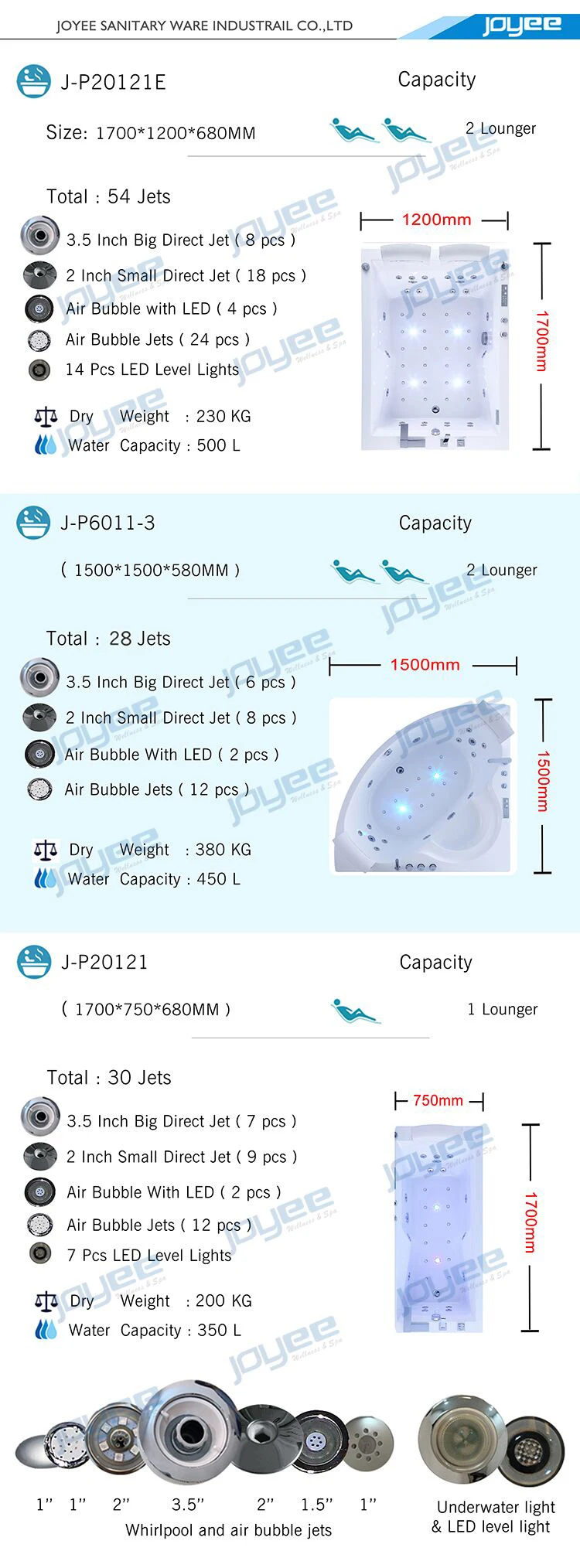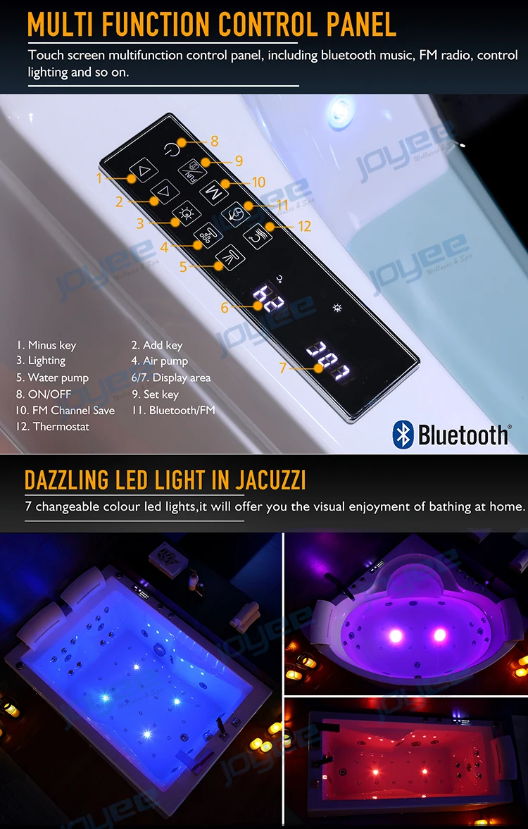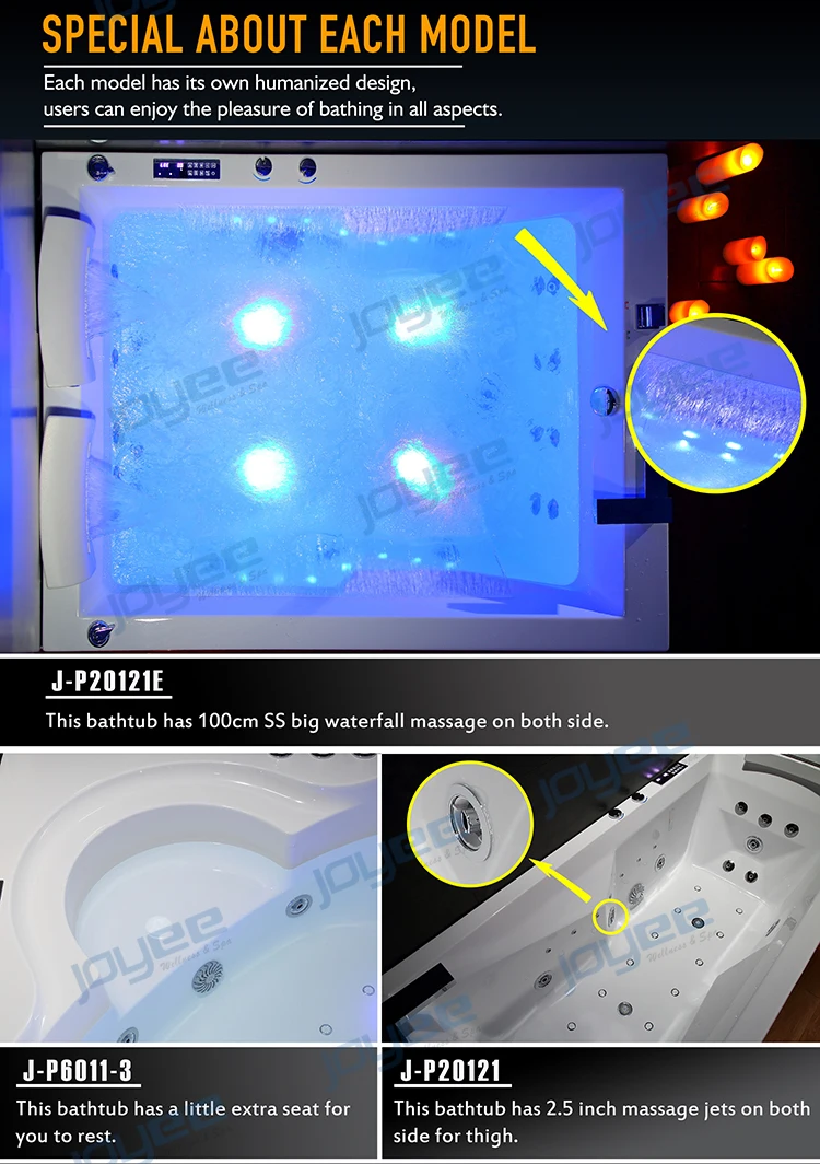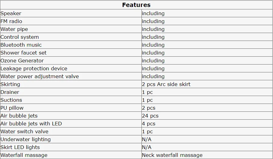 -Общая 54 струй (в том числе 8 шт. большие струи & 18 шт. маленькие струй, 24 шт. будут проходить воздушные пузырьки с массажной и 4 струй с светодиодный свет)