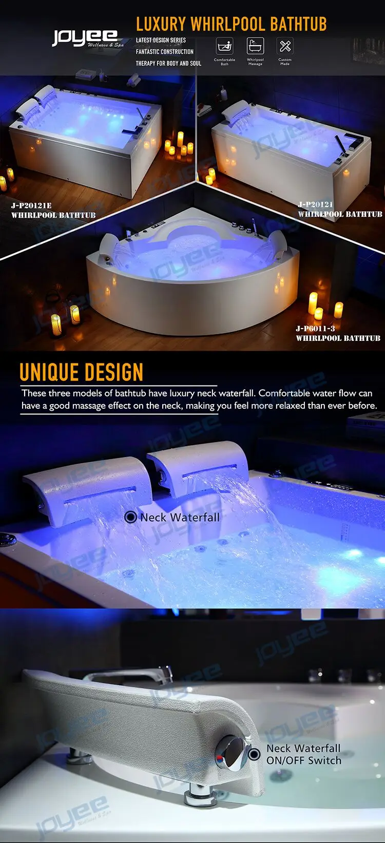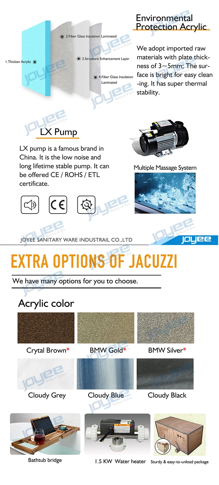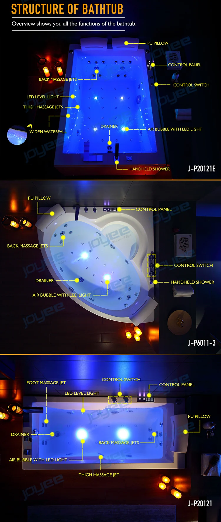 -Общая 54 струй (в том числе 8 шт. большие струи & 18 шт. маленькие струй, 24 шт. будут проходить воздушные пузырьки с массажной и 4 струй с светодиодный свет)
