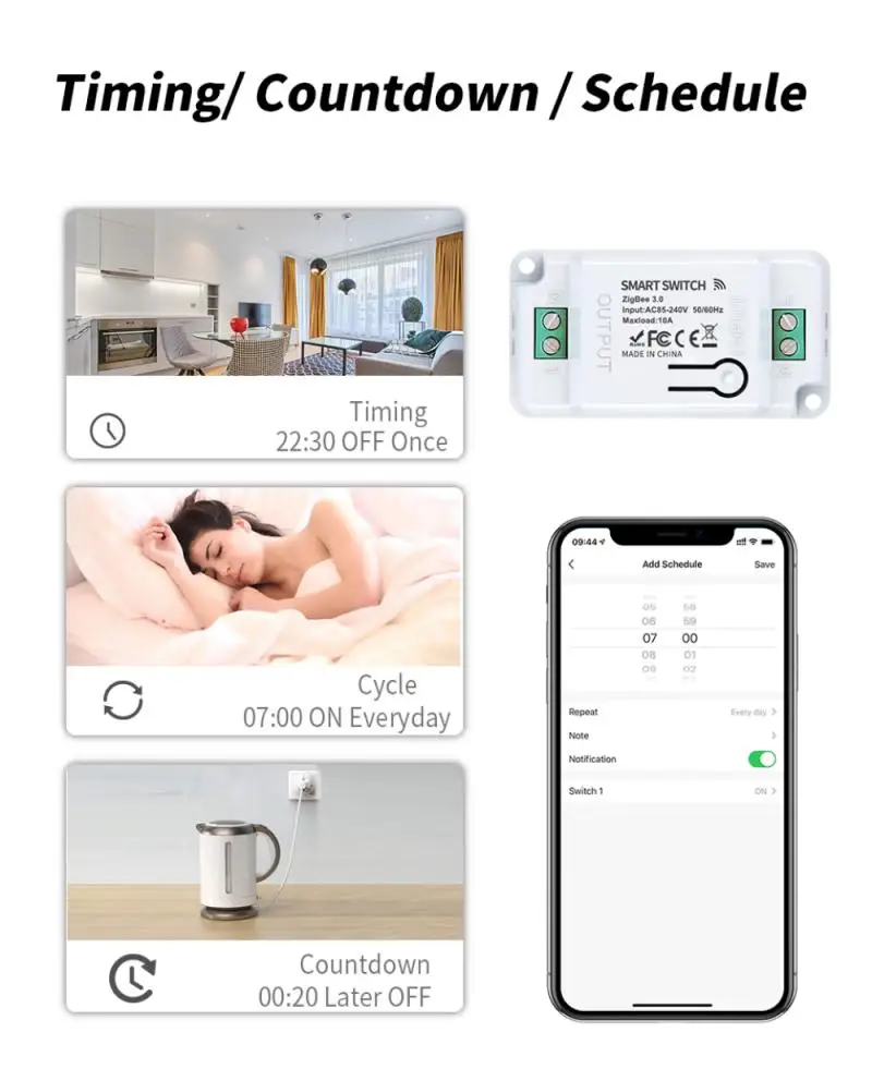 4. Время/время/Расписание: очень полезно установить расписание для автоматического включения/выключения устройства через приложение. Вы можете установить таймер обратного отсчета для увлажнителей, микроволновых печей, кофемашин и т. д., и устройство автоматически остановится. Не беспокойтесь о том, что устройство работает постоянно, это может помочь вам уменьшить ваши счета за электричество.