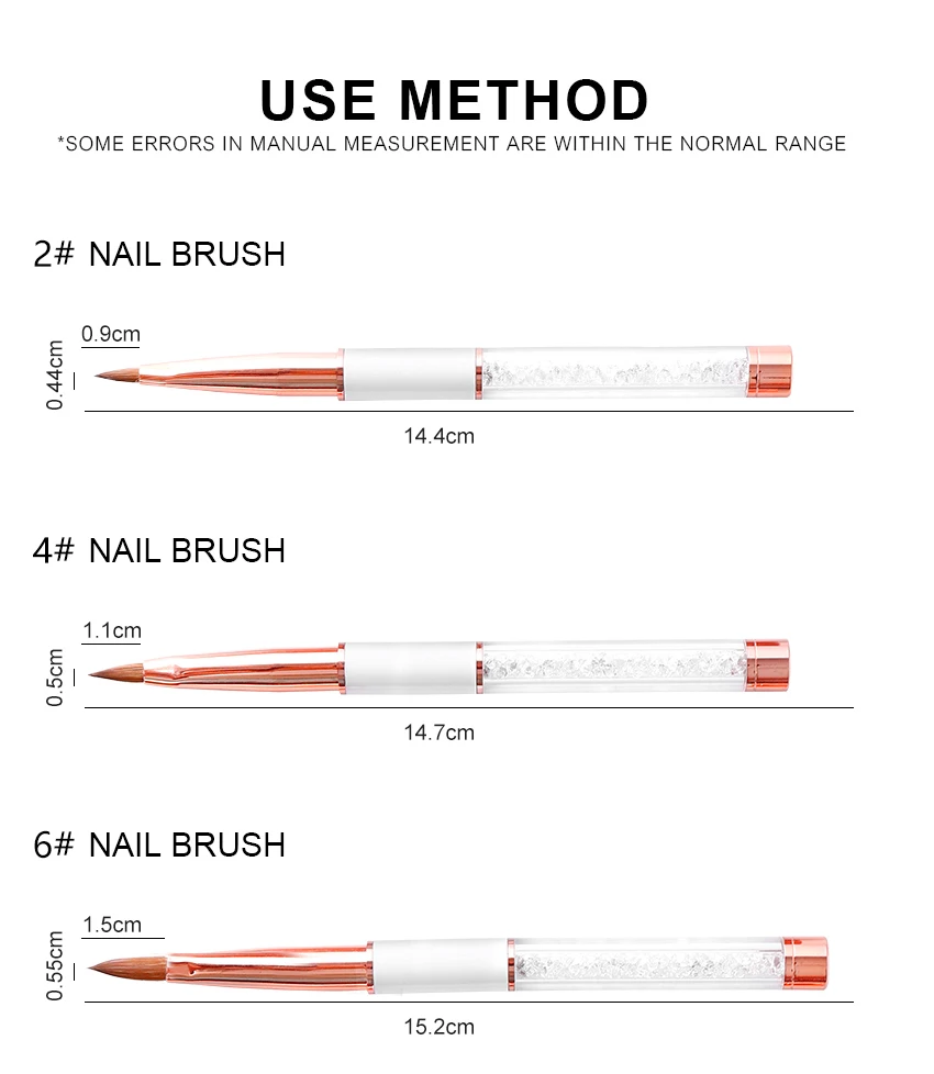 3. Кисти сделаны из лучших волос колински. Волоски кисти достаточно прочные, чтобы толкать и формировать акрил, но гибкие и мягкие, чтобы придать штрихи.