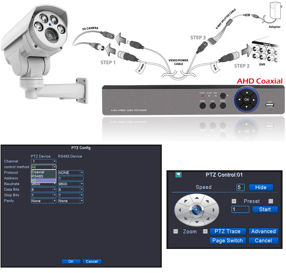 R: если ваша камера находится в режиме CVI или TVI и CVBS, вы должны связаться с вашим разъемом DVR 485, и видеорегистратор PTZ config выбрать
