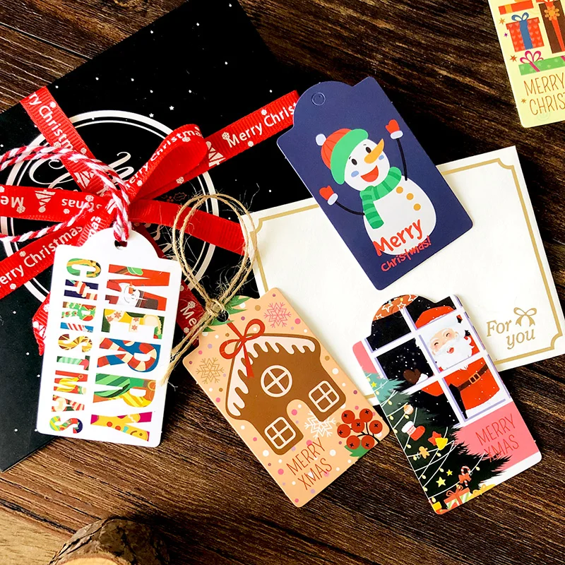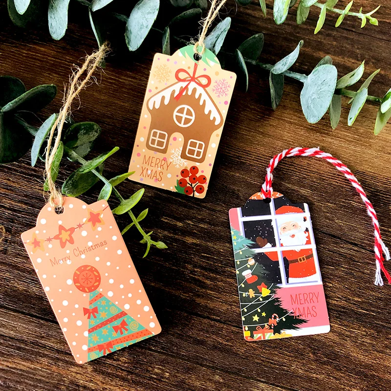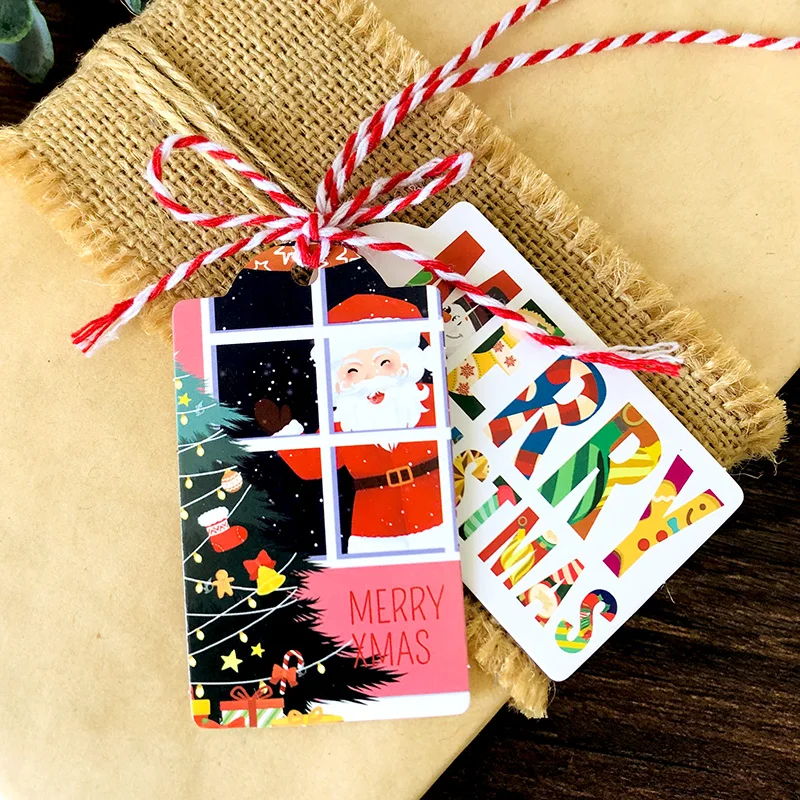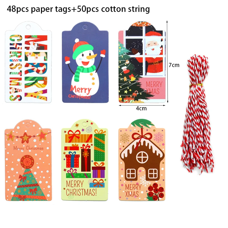 1. Размер одной бирки: 4x7 см; Длина веревки: 25 см/шт. 2. Дизайн: Санта-Клаус С Новым Годом Декор Подарочные бирки 3. Материал: бумага
