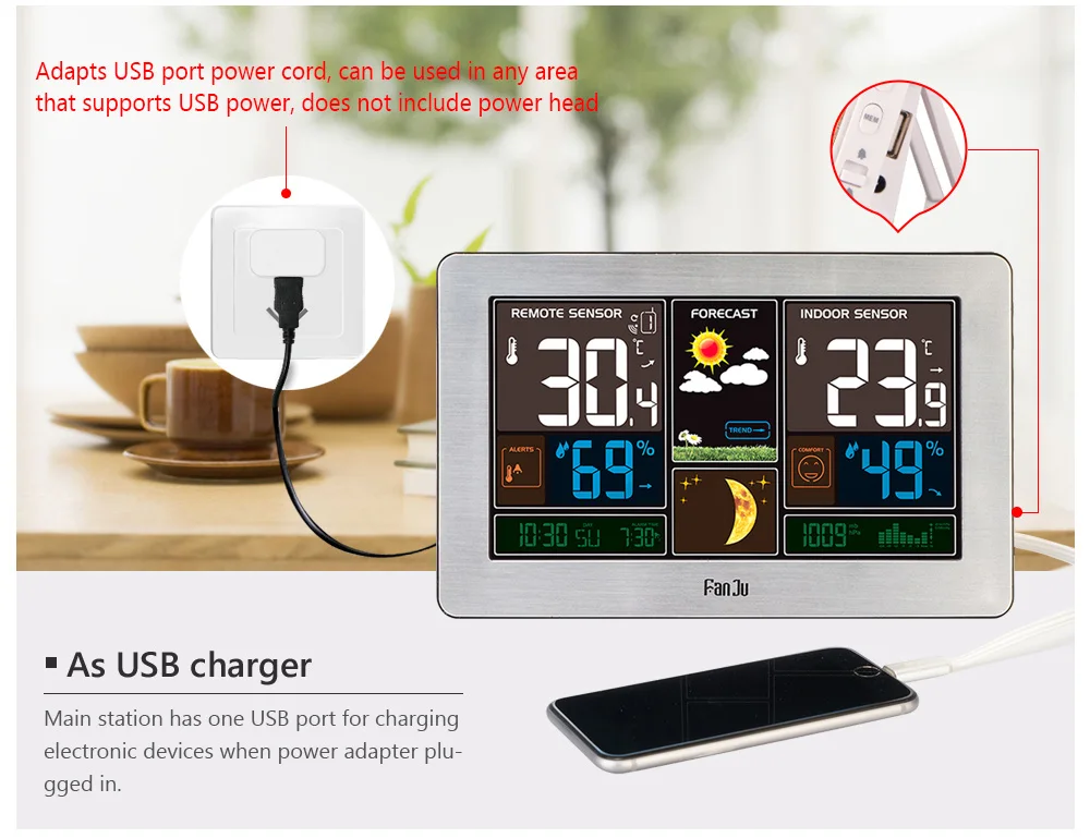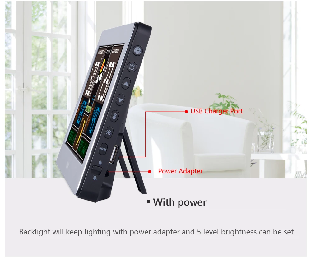 1. Функция прогноза погоды.2. Время в опциональном формате 12/24 часов.3. Usb-порт для зарядки электронных устройств.4. Внутренняя/наружная температура (°C или °F) и влажность.-Диапазон измерения температуры в помещении: 14 ℉(-10 °C) ~ 122 ℉(50 °C);-Наружные диапазоны измерения температуры: -4 ℉(-20 °C)~ 122 ℉(50 °C);-Диапазон измерения влажности в помещении и на улице: 20% RH ~ 95% RH.5. Барометрическое давление, температура и мороз оповещения. Появляется символ оповещения о льде и звуковой сигнал, когда наружная температура на 30 ℉(-1 °C)~ 37 ℉(2 °C).6. Минимальный/максимальный дисплей для влажности воздуха и температуры, используйте кнопку «MEM» для отображения на ЖК-дисплее.7. Тренд отображения давления воздуха, температуры и влажности.8. Уровень комфорта в помещении отображается по лицу. В/наружной температуре/влажности/Барометрический тренд показаны на ЖК-дисплее с 3 сигналами: повышение, сохранение и падение.9. Ежедневный будильник с функцией повтора.10. Календарь и фаза Луны.11. 5 уровней яркости подсветки опционально при использовании источника питания12.Отображение даты и дня недели (опция 7 языков)Время и дата, будильник, повтор, фаза Луны и подсветка: