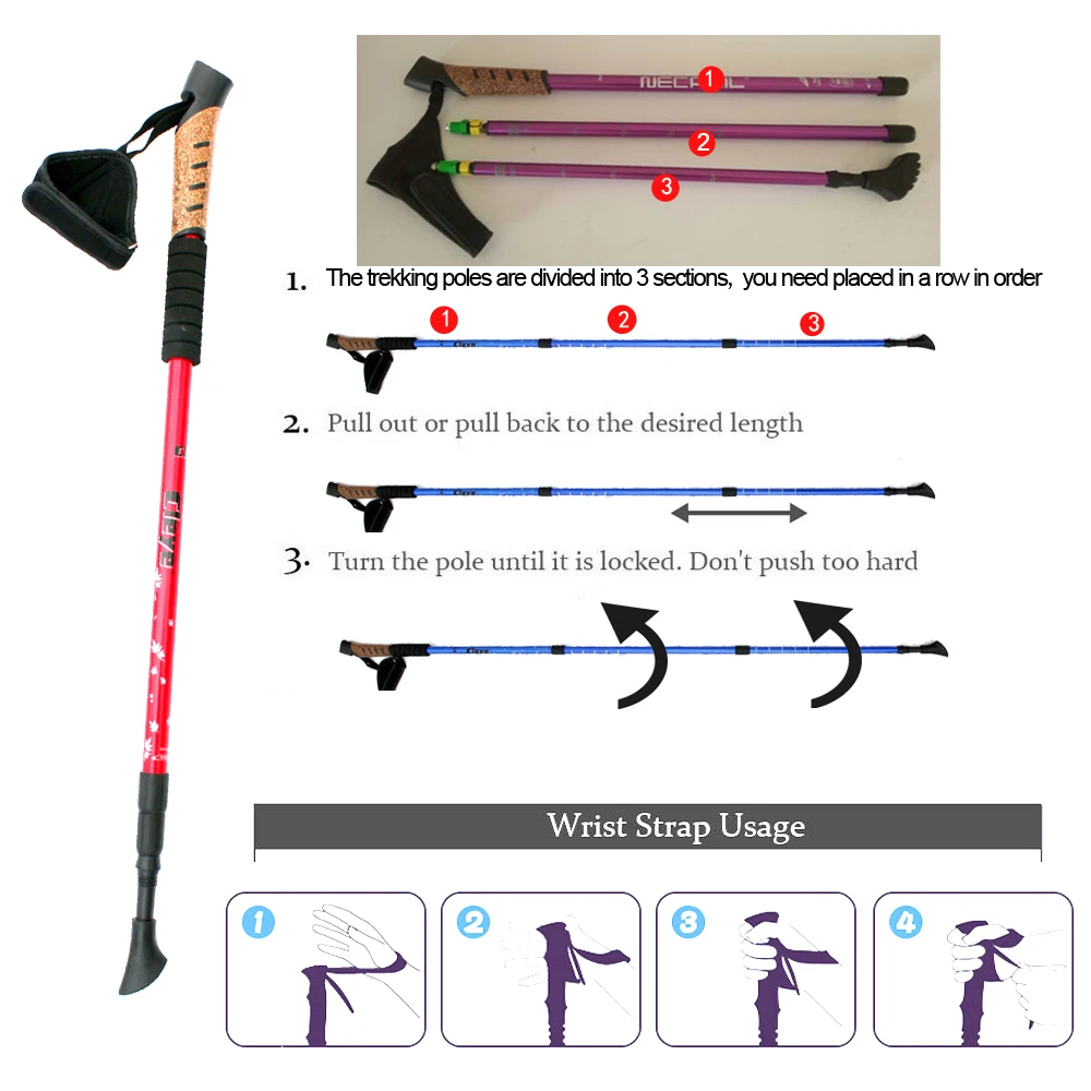 1. Треккинговые палки разделены на 3 секции, вам нужно разместить их в строке по порядку 2. Вытяните или оттяните до желаемой длины 3. Поверните стойку, пока она не закрепится. Не нажимайте слишком сильно PS: Не превышайте знак «стоп», иначе сломайте его легко. Если кончик в застрял в каменном шве, не встряхивайте его и вытягивайте вертикально, насколько это возможно