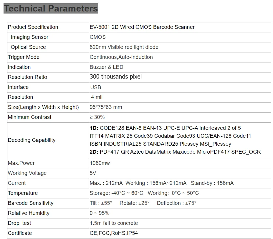 23 марта 2022Показать ещеСмотреть 1 отзывОписаниеEV-5001 CMOS 1D 2D PDF417 сканер штрих-кода